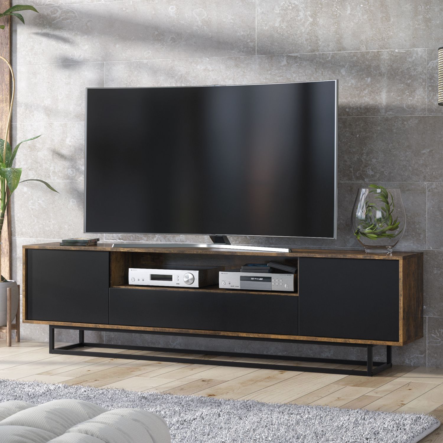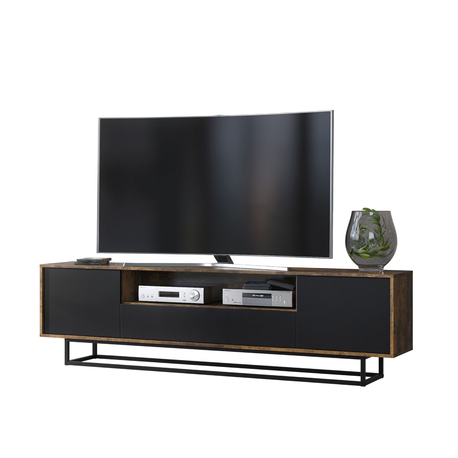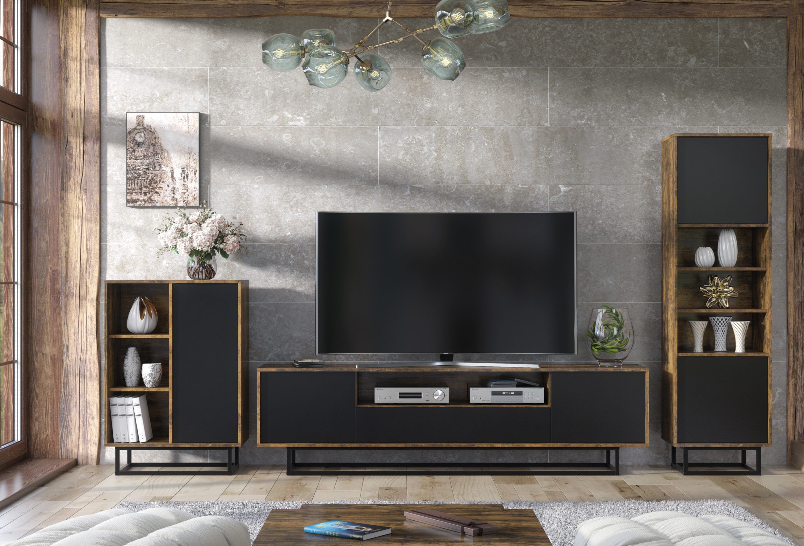 The PEARL Loft TV Unit combines industrial charm with contemporary design, making it the perfect centrepiece for your living room. Measuring 200cm (W) x 50cm (H) x 35cm (D), this unit is crafted from durable 16mm MDF and chipboard, ensuring lasting style and functionality. Bold black metal legs complement its clean lines, creating a loft-inspired aesthetic that suits any modern interior. Featuring two push-to-open doors on either side, it offers ample concealed storage for keeping your space tidy. A spacious drawer in the centre provides additional room for essentials such as remotes or gaming accessories, while the open compartment above is ideal for showcasing media devices or decorative pieces. Easy cable access at the back ensures a neat and organised entertainment setup. Available in warm, earthy finishes that bring character to your space, the PEARL Loft TV Unit is a standout addition to any home. Available in Dark Oak, Dark Oak & Black Matt Doors, and Rustic & Black Matt Doors.