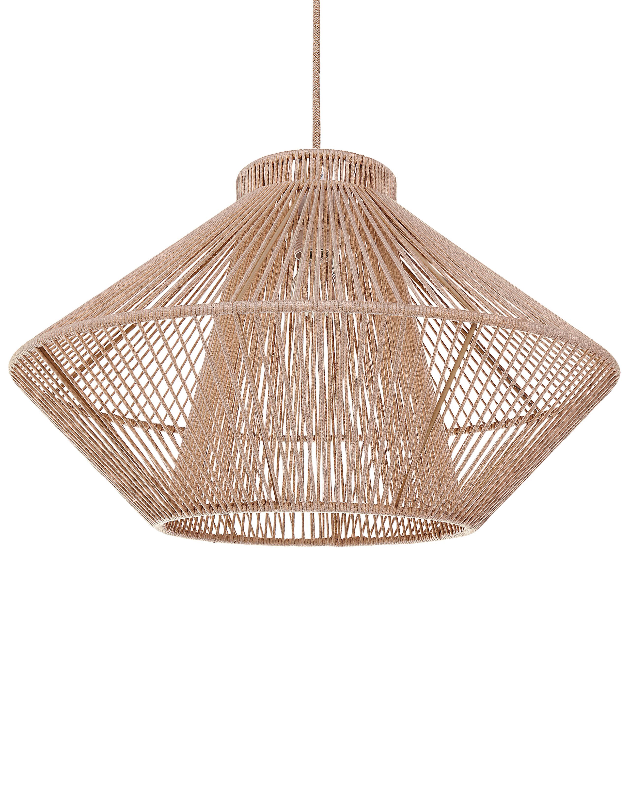 Bring a Japandi aesthetic to your home with this unique, handmade pendant lamp. Crafted out of cotton rope, the accessory draws attention with its cage shape in a natural, beige colour. Thanks to that design, it produces strong, pleasant light that is evenly dispersed through the room. Hang it over your dining table or sofa to gain a wonderful, long-lasting and functional decoration. Details: Color: Beige. Main material: Cotton. Additional material: Iron. Weight: 1.2 Assembly: Requires Installation
