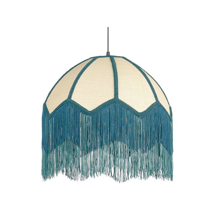 Discover nostalgia reimagined with this pendant lamp featuring a retro fringed shade. Crafted using intricate wicker techniques from paper rope, this lamp embodies the essence of Art Deco. Elevate your space with a touch of vintage flair and artistic craftsmanship, a timeless centrepiece that will certainly draw the attention of all your guests. Details: Color: Blue, Natural. Main material: Paper. Additional material: Iron. Material Composition: 100% Polyester Weight: 1.8 Assembly: Does Not Require Assembly