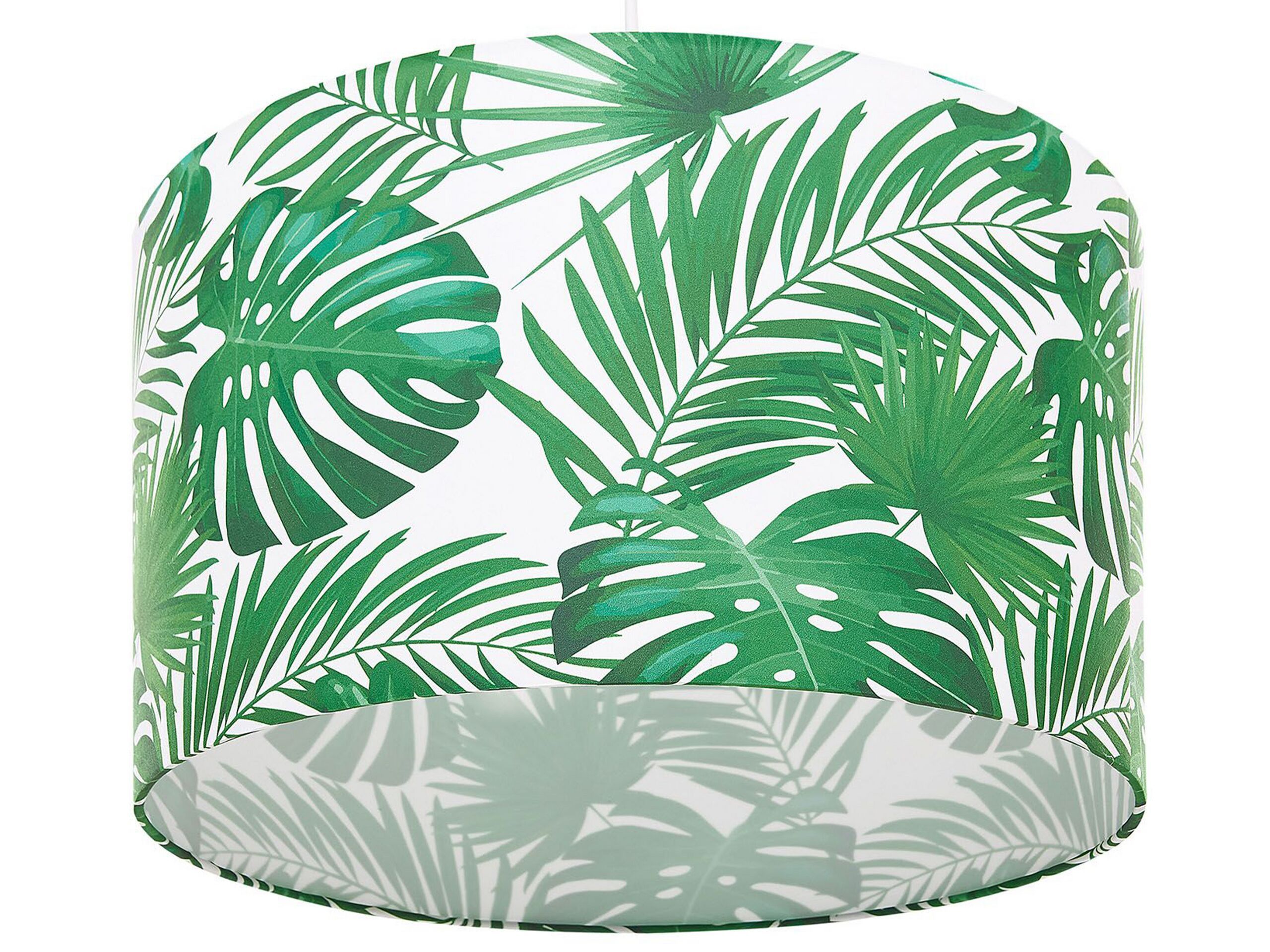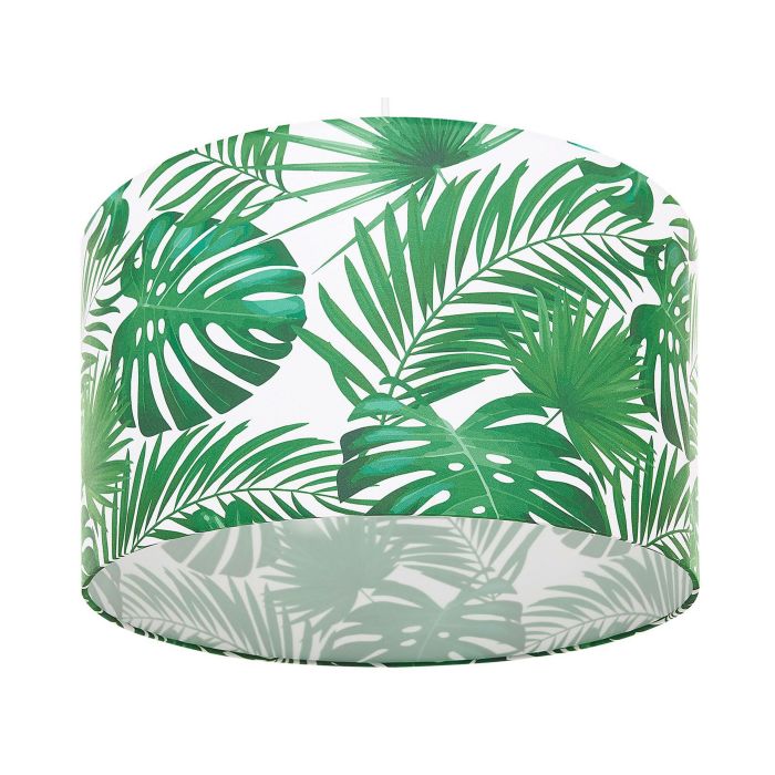 A ceiling ambient lamp with a drum-shaped shade is an all-time favourite choice for any kind of interior. Its cover is made of durable fabric in white and is decorated with a green leaf pattern. The electric cord attached to the lamp is almost unnoticeable, thanks to the matching white colour. Simple form in combination with its decorative pattern creates a unique piece that fits all decor styles. Details: Color: White, Green. Main material: Polyester. Additional material: Synthetic Material. Material Composition: 100% Polyester Weight: 2 Assembly: Requires Installation and Assembly