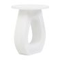 The PENWYTHA accent table is crafted from mango wood in a whitewash finish, featuring an elegant rounded base with a cutout aesthetic.