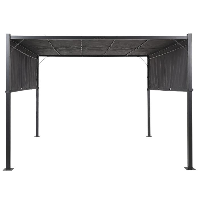 Spend time with your family and friends outside even during hot summer days, and provide yourself with an awning over your garden lounging or dining set. The robust pergola is made of durable, powder-coated steel that guarantees stable construction and a UV-resistant sliding canopy that can be moved from one side to another. What is more, if you will switch on the solar panel and wait until dusk comes, the LED lights will automatically illuminate the space. Details: Color: Grey, Black. Main material: Polyester. Material Composition: 100% Polyester Weight: 42 Assembly: Full Assembly Required