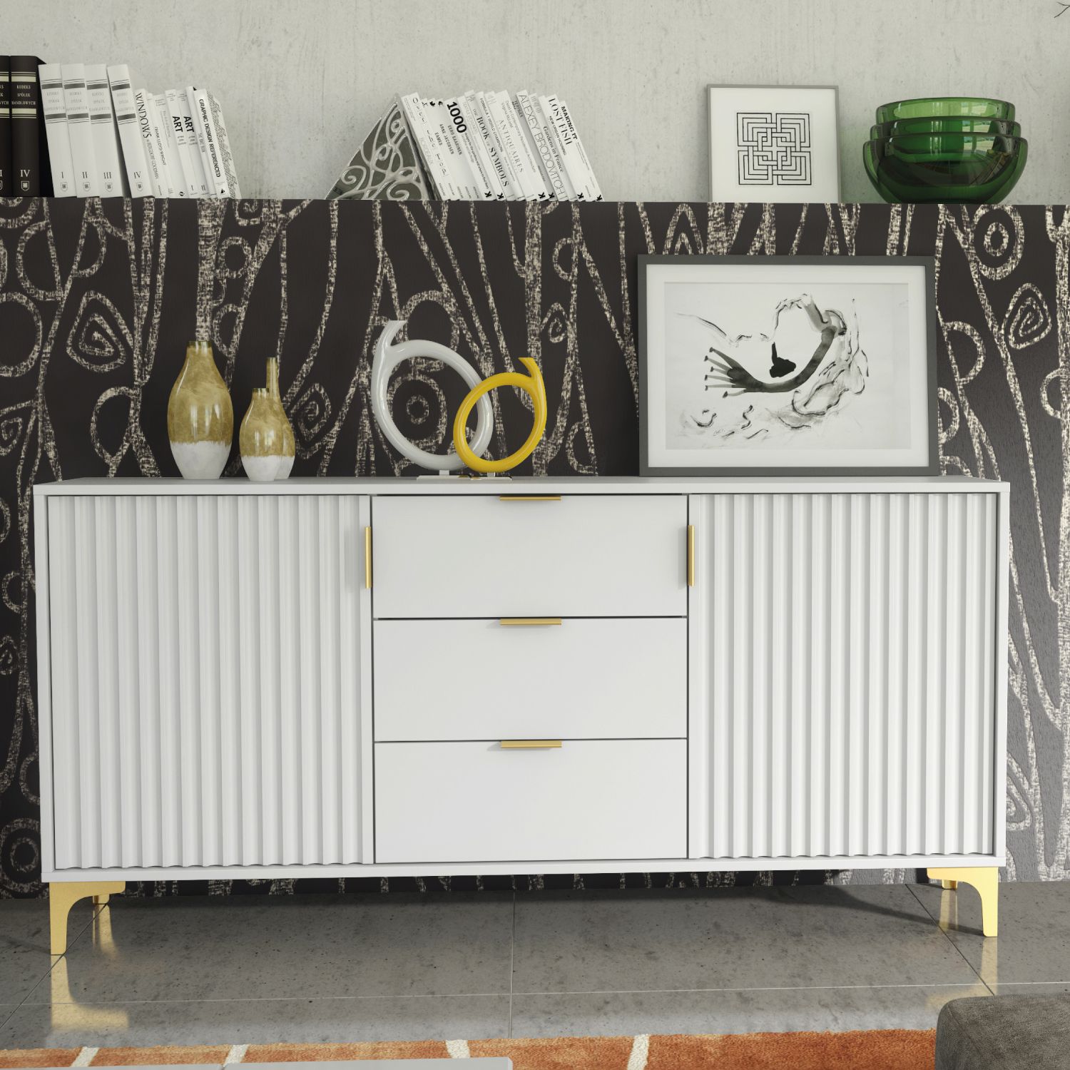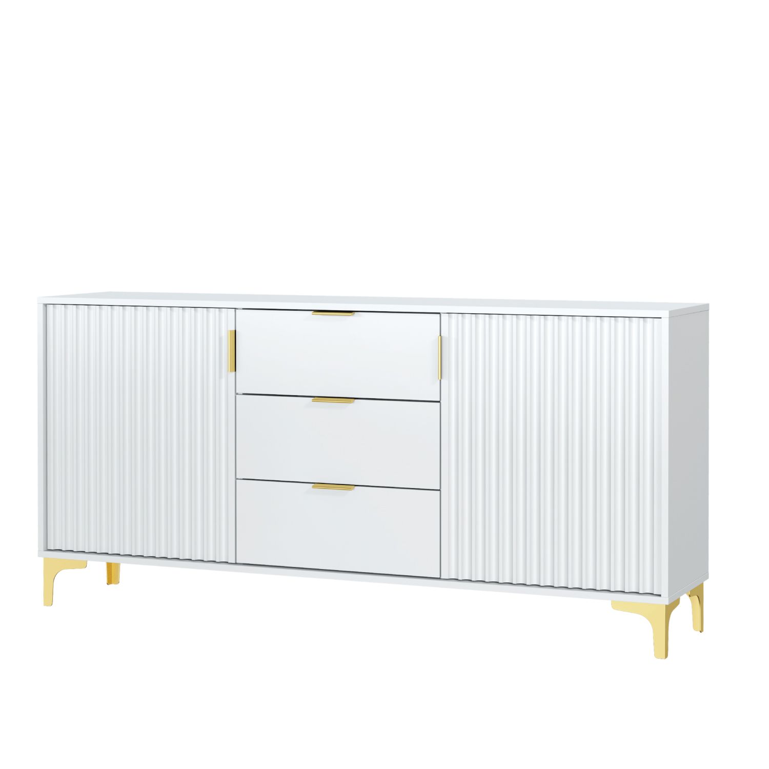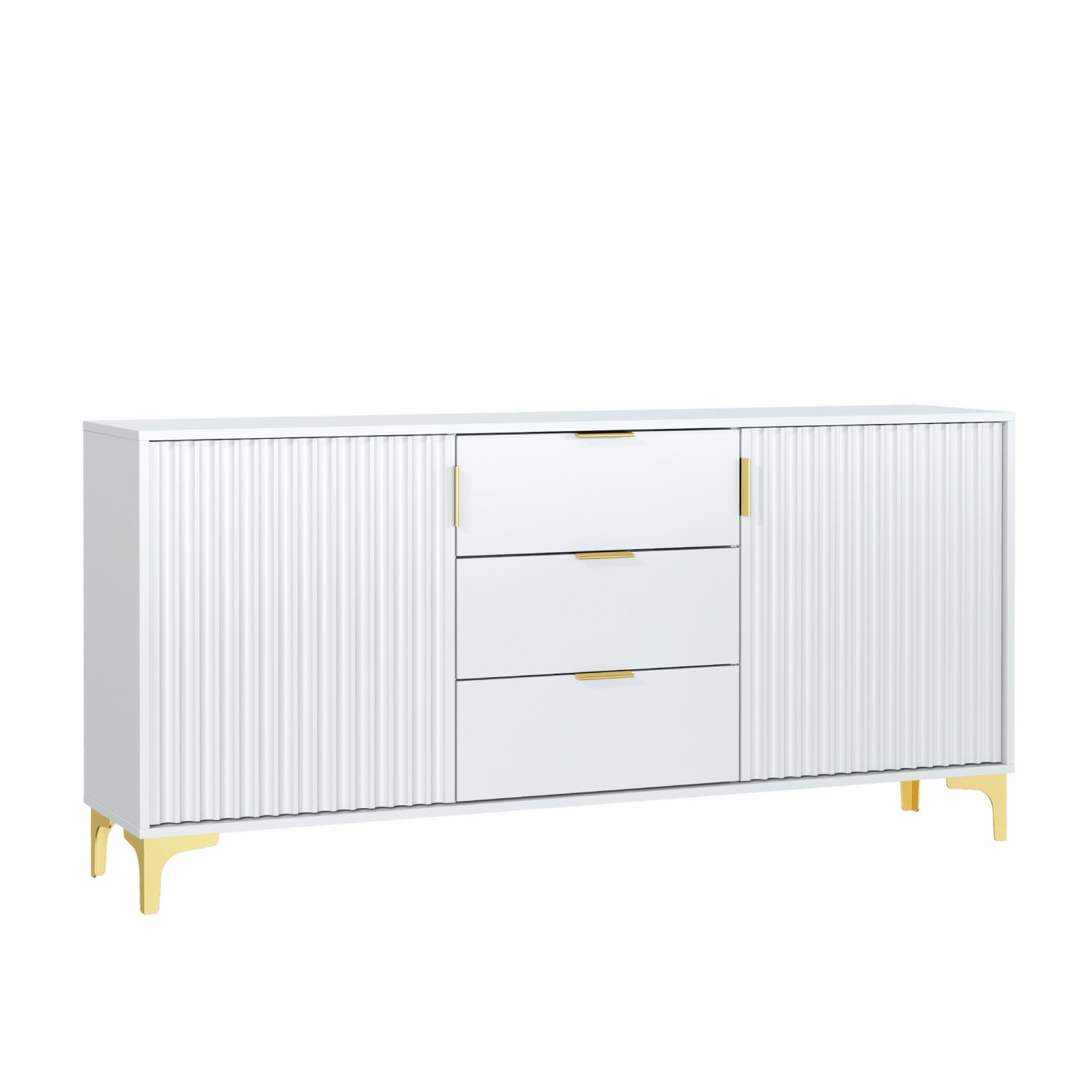The PERUGIA Crest Gold Sideboard combines contemporary elegance with practical storage, making it an essential addition to any modern living space. Measuring 140cm (W) x 80cm (H) x 35cm (D), this sideboard is crafted from high-quality 16mm chipboard and MDF, ensuring a durable build with a sleek and polished finish. Featuring two large fluted doors with gold handles, it opens to reveal a spacious interior with shelves, perfect for organizing larger items or keeping your space tidy. The center section includes three drawers, offering additional storage for smaller essentials, seamlessly blending functionality with sophistication. Set on gold-colored metal legs, the PERUGIA Crest Sideboard balances modern design with a touch of luxury, providing both stability and refined style. Available in White & Gold Accents or Dark Grey & Gold Accents, this versatile sideboard enhances the elegance of any living room, dining area, or hallway while providing ample storage solutions.