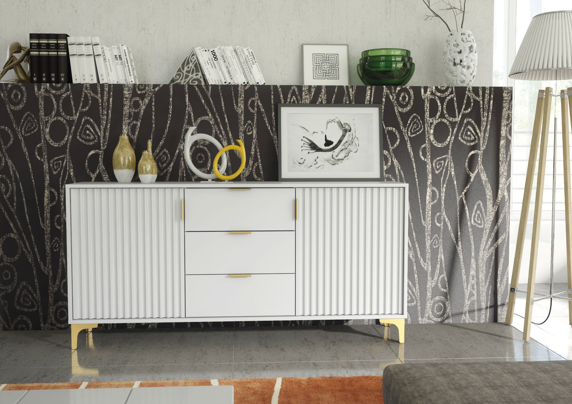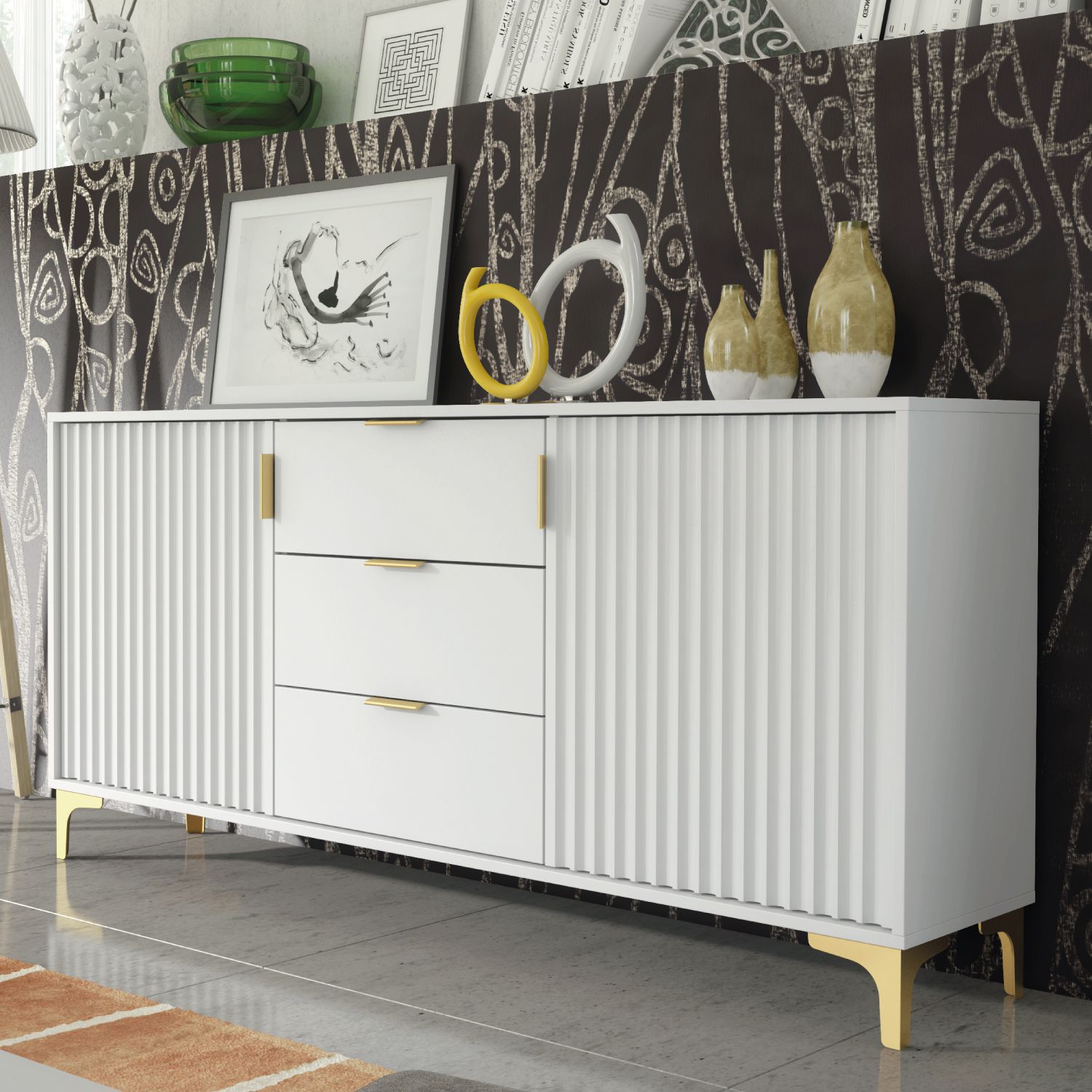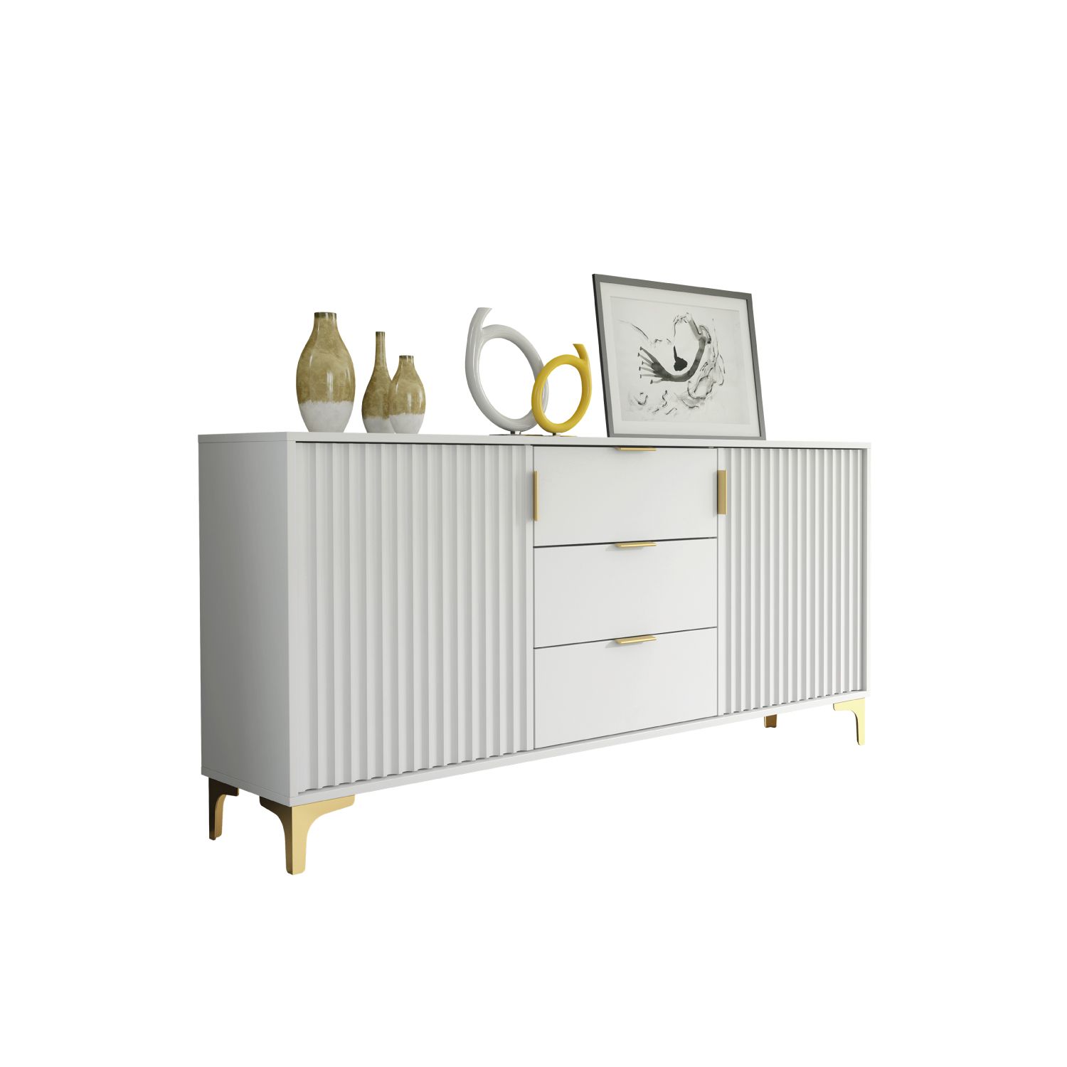 The PERUGIA Crest Gold Sideboard combines contemporary elegance with practical storage, making it an essential addition to any modern living space. Measuring 140cm (W) x 80cm (H) x 35cm (D), this sideboard is crafted from high-quality 16mm chipboard and MDF, ensuring a durable build with a sleek and polished finish. Featuring two large fluted doors with gold handles, it opens to reveal a spacious interior with shelves, perfect for organizing larger items or keeping your space tidy. The center section includes three drawers, offering additional storage for smaller essentials, seamlessly blending functionality with sophistication. Set on gold-colored metal legs, the PERUGIA Crest Sideboard balances modern design with a touch of luxury, providing both stability and refined style. Available in White & Gold Accents or Dark Grey & Gold Accents, this versatile sideboard enhances the elegance of any living room, dining area, or hallway while providing ample storage solutions.