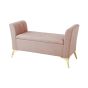 Give an underused window bay as or other bedroom nook as an eye-catching feature with this gloriously elegant window seat. The gently flared arms feature a classic sculpted design and flank a comfortable seat beneath which is concealed a useful lined storage compartment as perfect for blankets and throws. The deep padded frame and seat is upholstered in a tactile plush fabric with a matt velvet pile that looks and feels wonderfully indulgent. The angled gold-effect metal legs add a contemporary contrast to the seats classic lines. Pick from blush pink and soft grey colourways.