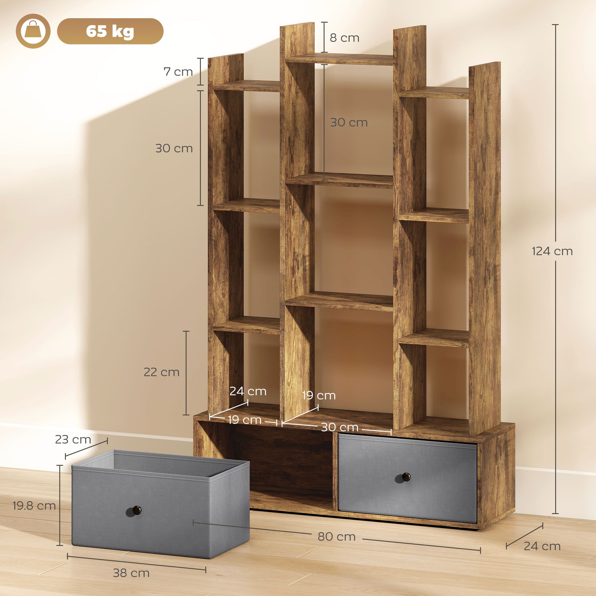12 shelves and two drawers: cube storage shelf unit offers plenty of room for organising and displaying items. The drawers provide hidden storage to avoid your space looking cluttered and disorganised. Solid construction: made from particle board, with a wide 80 cm base - bookshelf is a piece made to be used every day. Anti-tipping hardware included to securely attach to a wall. Compact size: 80 x 24 cm - this bookcase is a top choice for smaller rooms and homes. A space-saving design which effortlessly slots into corners. Multi-use piece: storage unit can also be used as a room divider, a media shelf or display unit for your books, ornaments and more. Suitable for use in every room. Dimensions: 124 H x 80 W x 24 D cm. Drawer inner: 19. 8 H x 38 W x 23 D cm. Maximum load 65 kg. Easy to assemble