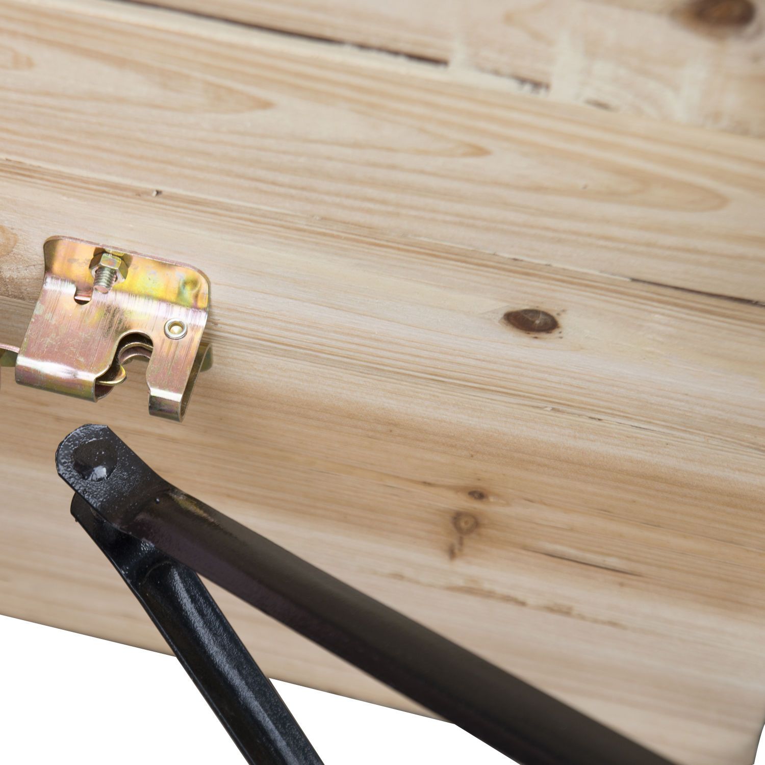 - Tabletop and benches of the folding garden furniture are made from fir wood and varnished.