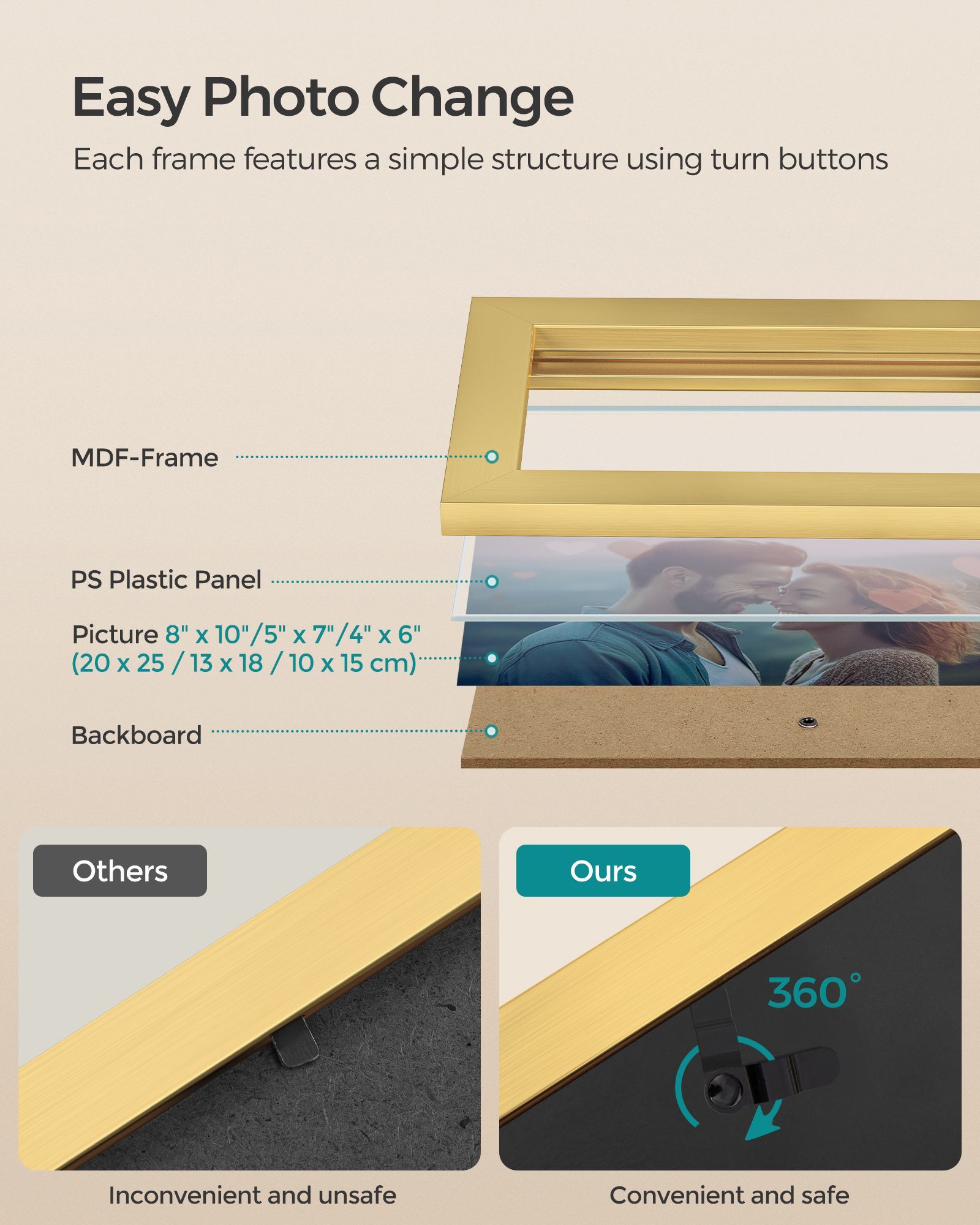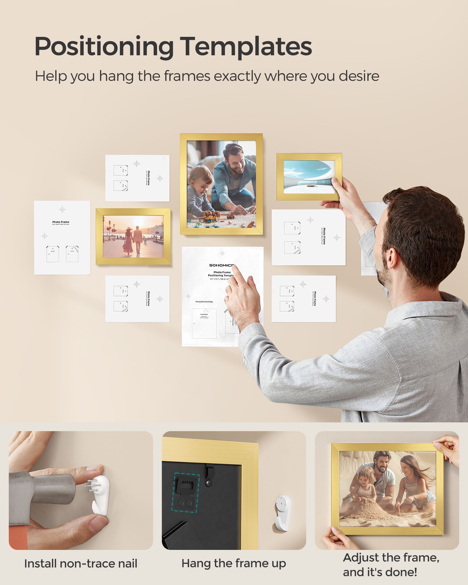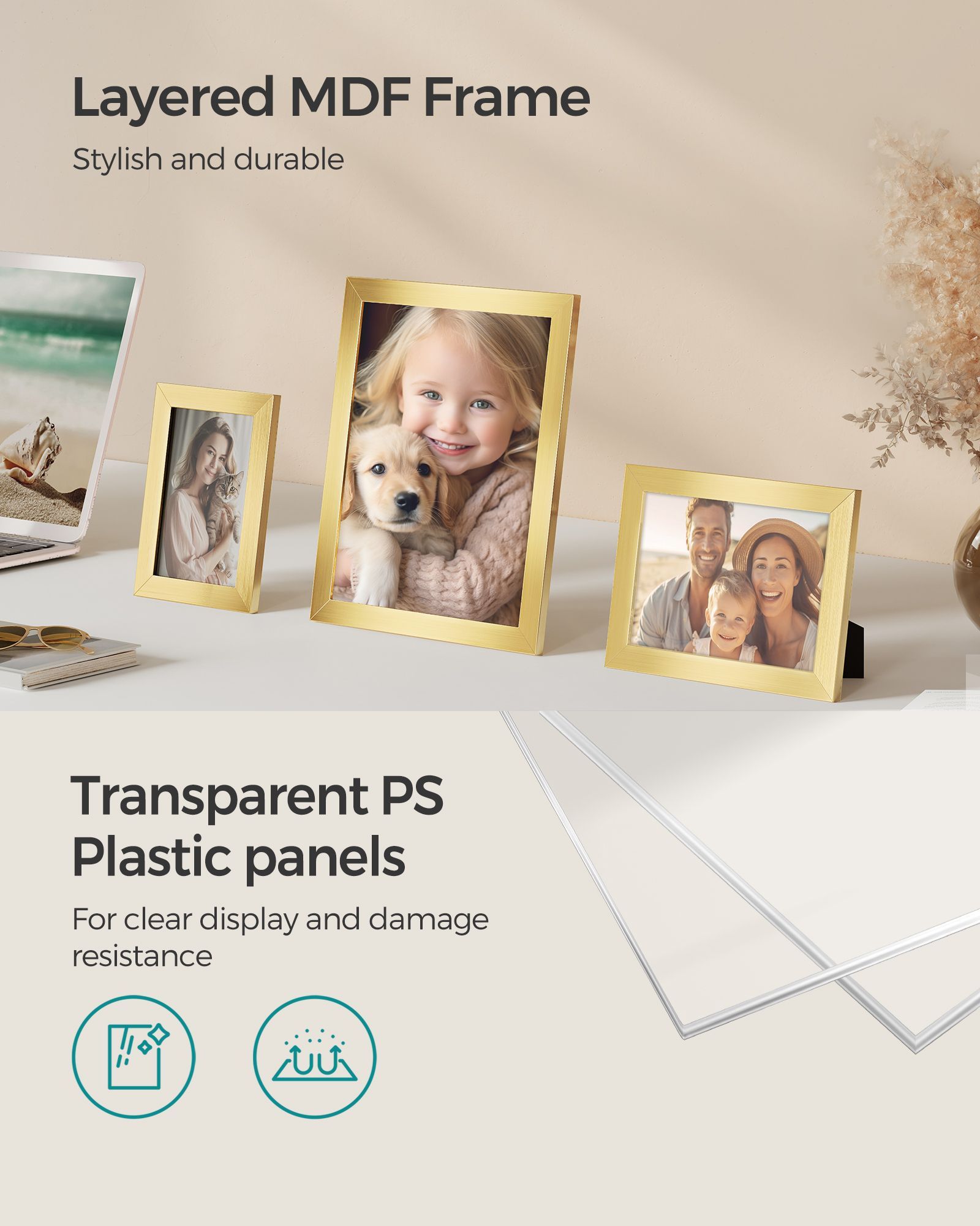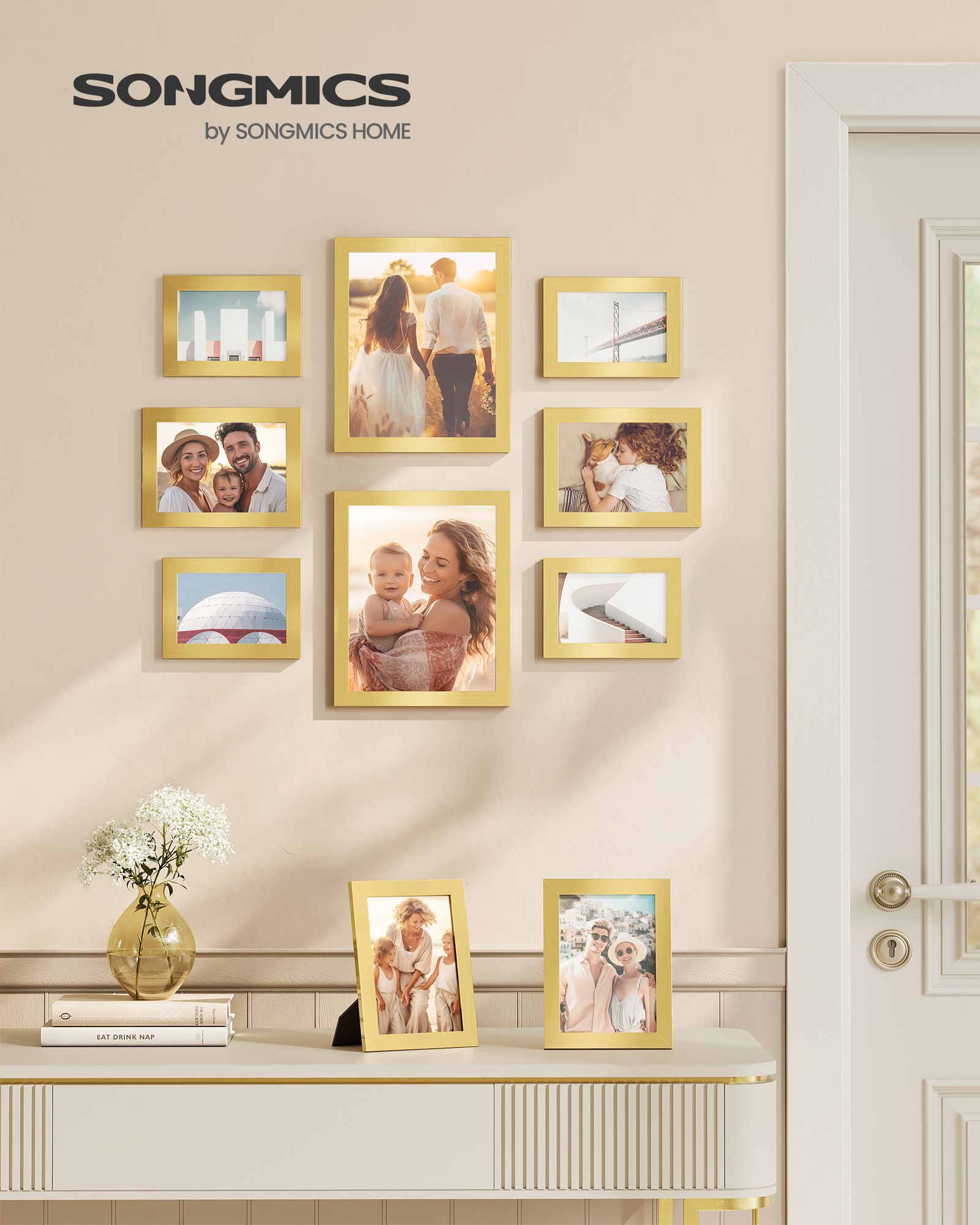 Display your cherished memories with this elegant set of 10 pale gold picture frames. Including two 8"x10", four 5"x7", and four 4"x6" frames, this collection offers versatile sizing for any photo. The classic pale gold finish adds a touch of sophistication to your home decor, making it perfect for showcasing family portraits, travel snapshots, or artwork.