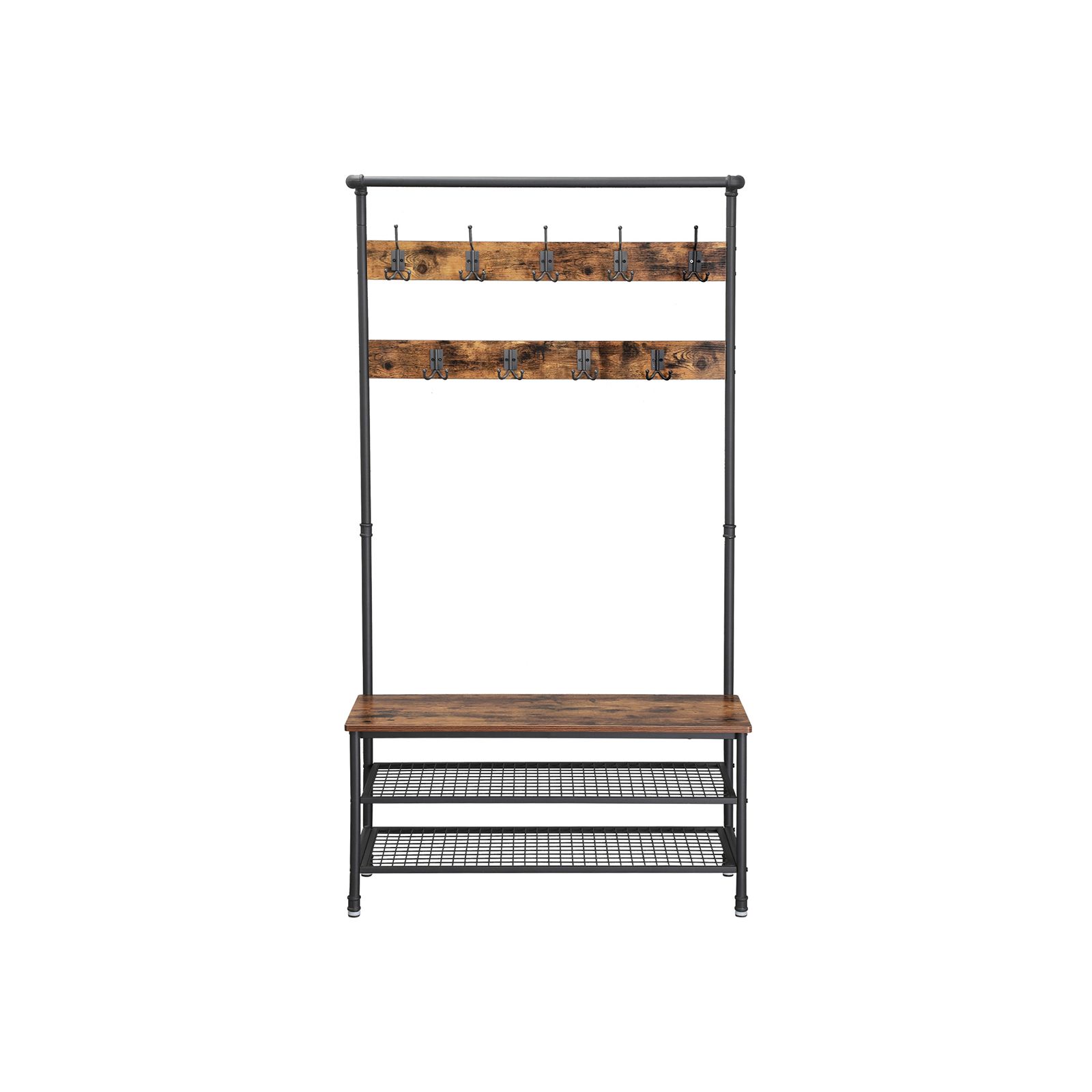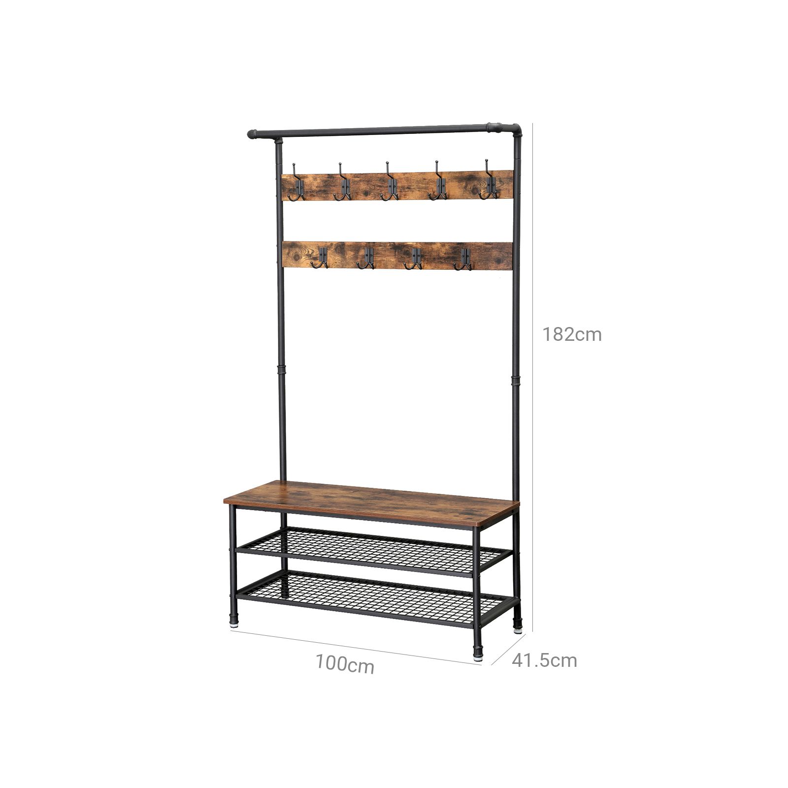 The designers at VASAGLE work to give you the opportunity to turn your home into something unique and special with every piece of furniture.Rustic Coat Rack in Industrial DesignThis coat stand is designed with a storage bench, giving you a comfortable seat with 2 mesh shelves for storing shoes. It also has a hanging rail and 9 differently arranged hooks for organising keys, bags or clothes. Designed in trendy industrial pipe design with rustic wooden elements, this coat rack is particularly suitable for large or open rooms that are not yet too crowded with other furnishings. Position the hat and coat stand in your hallway to hang jackets and coats and to put on your shoes comfortably.However, this hall tree should never be the only piece of industrial design in your home! Take a look at the other VASAGLE creations as well.