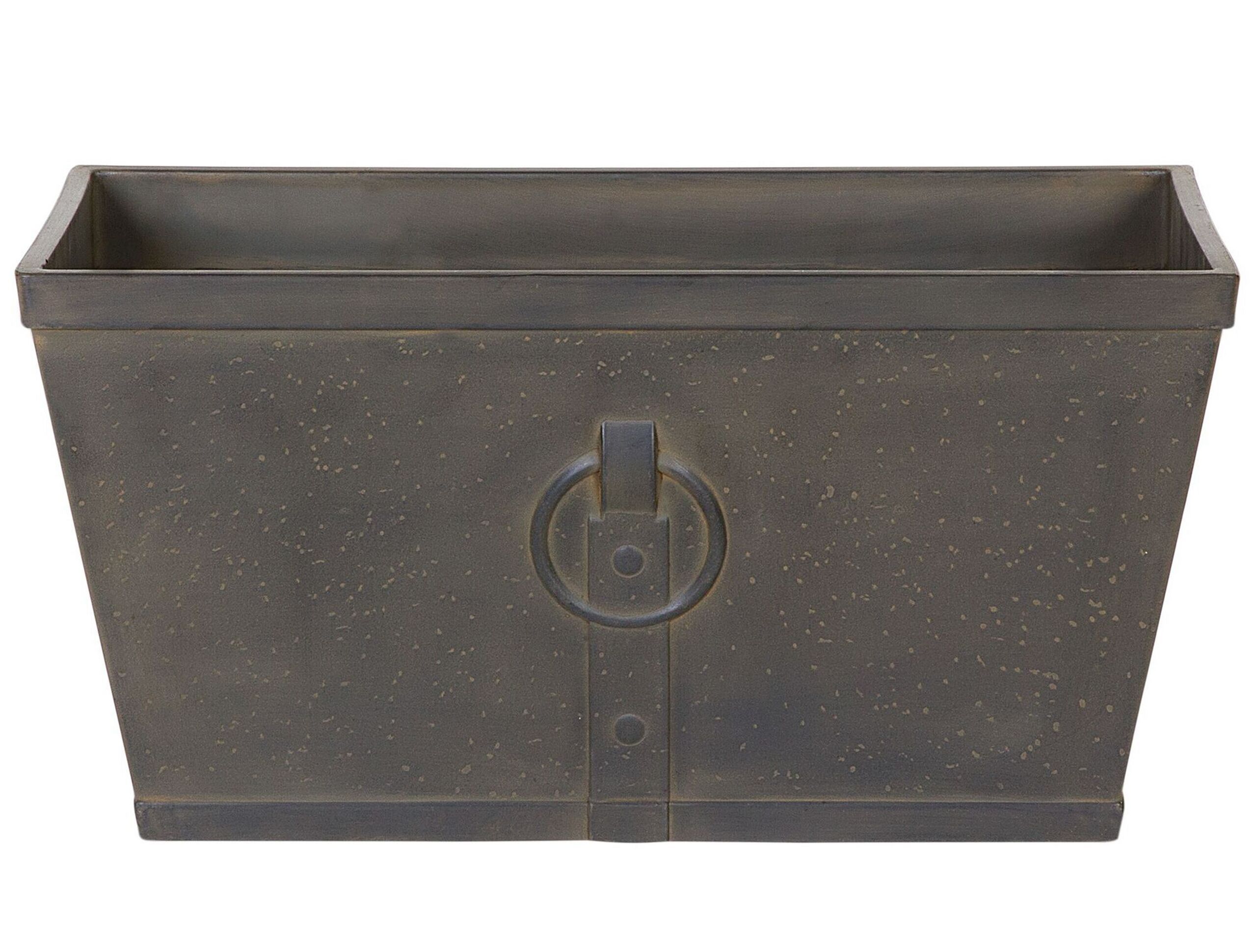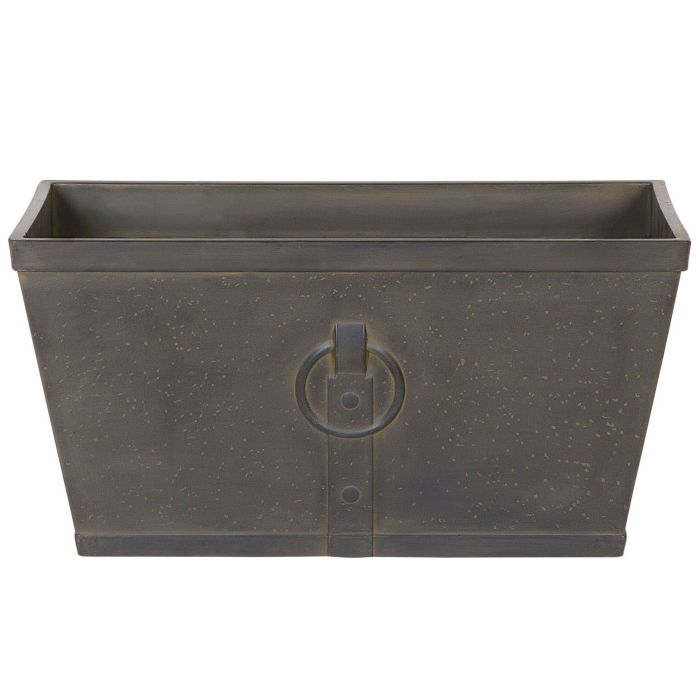 Give your home a touch of vintage elegance with this decorative planter. Made from all-weather fibre clay that makes it suitable for both indoor and outdoor use. The piece features a classic rectangular shape and flared body. The distressed, dark brown finish and delicate accents highlight its unusual, sophisticated style and make the plant pot an ideal embellishment to any traditional or retro setting. Details: Color: Brown. Main material: Fibre Clay. Additional material: Fibreglass. Weight: 5 Assembly: Does Not Require Assembly