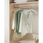 Declutter your wardrobe with these essential hangers! This pack of 50 cloud white plastic hangers features shoulder notches for delicate items. Also available is a pack of 30 heavy-duty grey hangers, boasting wide shoulder notches, a trouser bar, and a 360° swivel hook for ultimate space-saving organization. Perfect for coats, shirts, and trousers, these hangers keep your clothes neat and accessible.