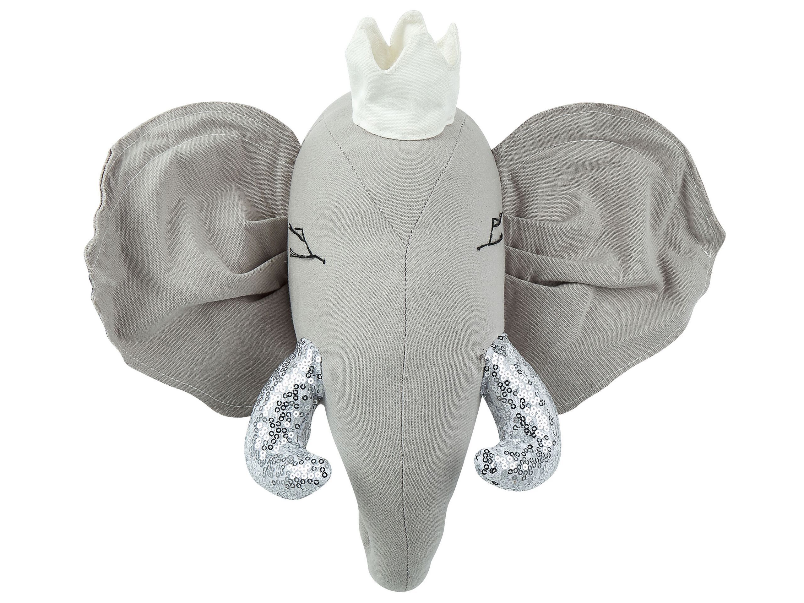 Give the room of your little one a unique children's character thanks to unique decorations. This plush wall ornament in the shape of an elephant is sure to charm everyone. Its sequin silver fangs and small crown are the elements that give it exceptional charm. Place it above the bed and combine with other accessories so that your little toddler can enjoy the space created especially for them. Details: Color: Grey, Silver, White. Main material: Cotton. Weight: 0.2 Assembly: Does Not Require Assembly