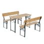 - Constructed from a metal frame with a wooden seat, backrest and table top.