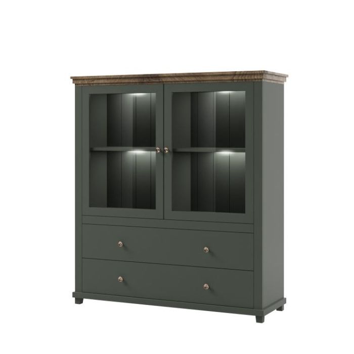 Create a wonderful display of your treasured collection with this stunning display cabinet. Perfect for displaying your prized books, decorative pieces or other collectables, as well as benefiting from its two drawers and two partially-glazed hinged doors for extra storage. It is constructed from high-quality 16mm laminated board and finished in the timeless Oak Lefkas with stylish green and would look fantastic in any modern or contemporary environment.