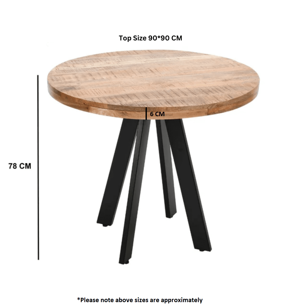 The 4 seater round dining table in this Range is perfect for both entertaining dinner guests and family meals. Team with your own selection of chairs from our extensive ranges. The rough sawn laquered finish top and the spider metal legs are both rustic and modern, highlighting the natural beauty of the wood with a handmade unique look and feel. Made entirely using 100% Eco sourced solid natural wood by skilled craftsmen in India.