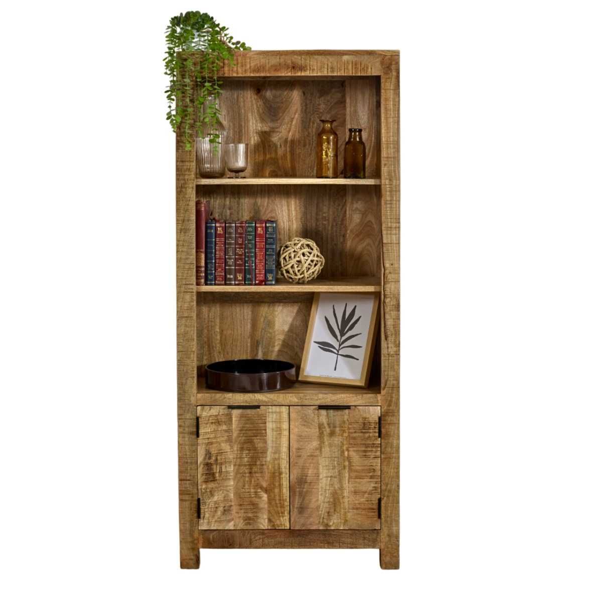 Combining a fresh modern look with rustic reclaimed wood and beautifully crafted into a sturdy bookcase for any room in your home. Featuring 3 deep open display areas you can showcase your books / ornaments etc and store any unwanted items out of sight in the spacious cupboard. The rough sawn laquered finish highlights the natural beauty of the wood with a handmade unique look and feel. Made entirely using 100% Eco sourced solid natural wood by skilled craftsmen in India.