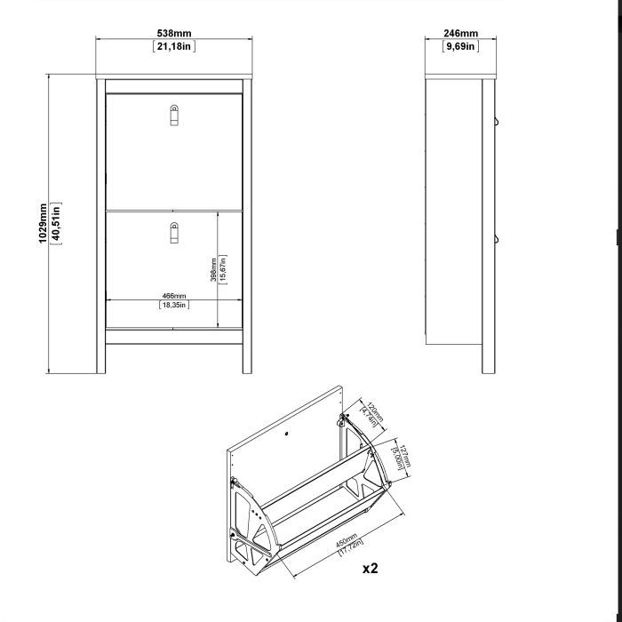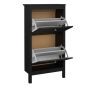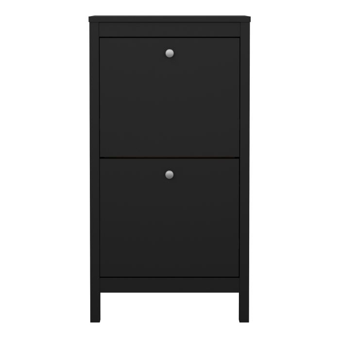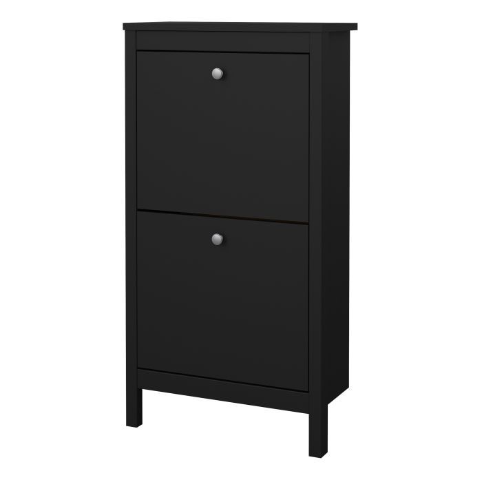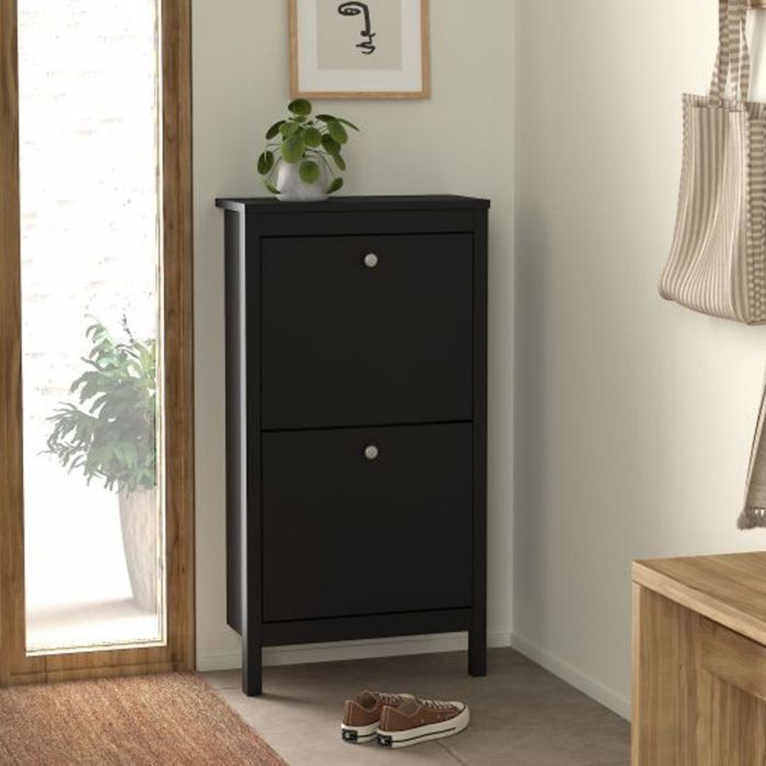A sophisticated and modern shoe storage unit designed to add an elegant touch to your space. With its sleek design and a simple metal handle, this two-door cabinet offers a perfect blend of style and functionality. For those seeking a bolder statement, it is also available in a contrasting white finish.