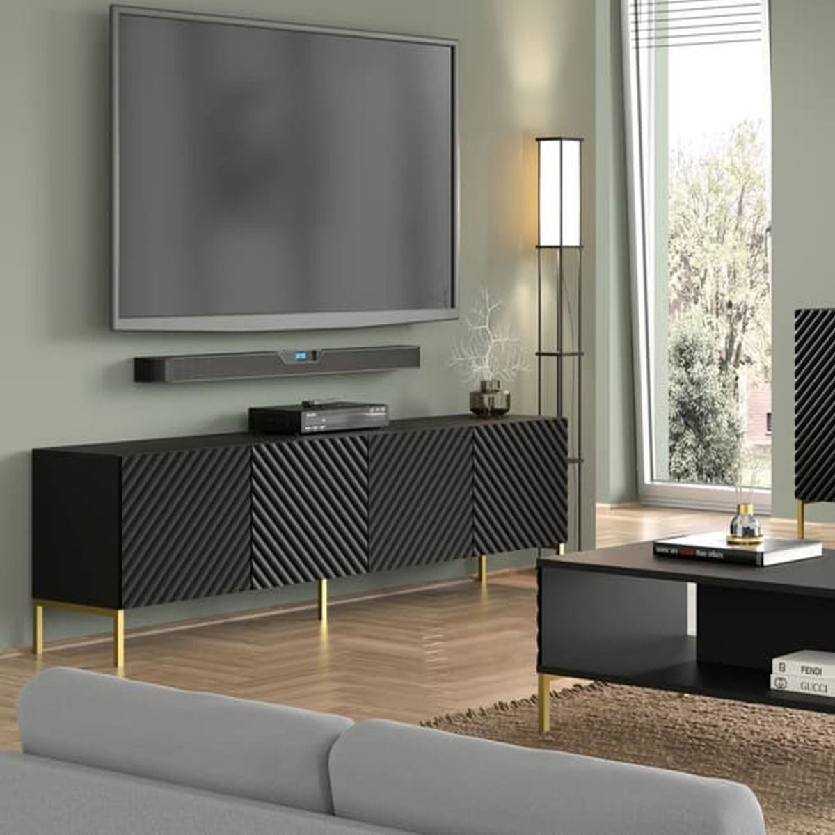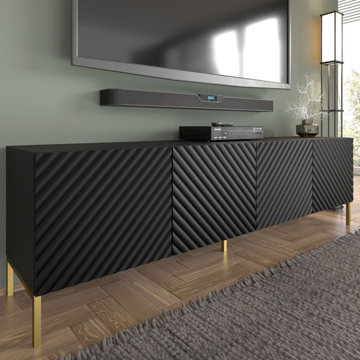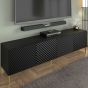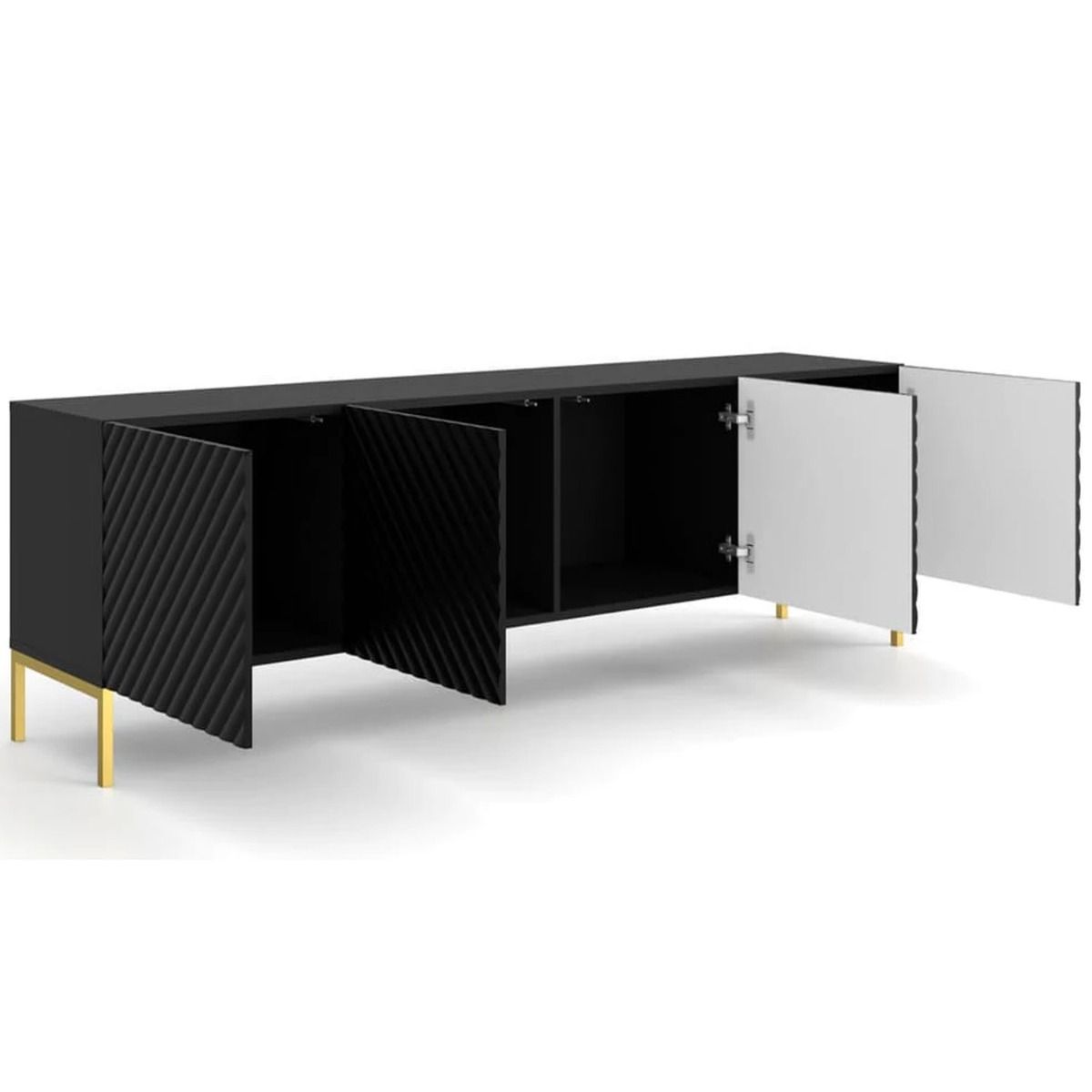 Elevate your entertainment setup with the Puddle Dux 4 Door TV Cabinet—a sleek blend of style and functionality. Boasting four hinged doors with a convenient push-to-open system, it offers easy access to your media essentials. The gold metal legs add a touch of sophistication, while the MDF fronts contribute to its modern aesthetic. Crafted from high-quality 16mm laminated board, this TV cabinet ensures durability and visual appeal. Assembly is required, providing an opportunity to personalize your entertainment space.