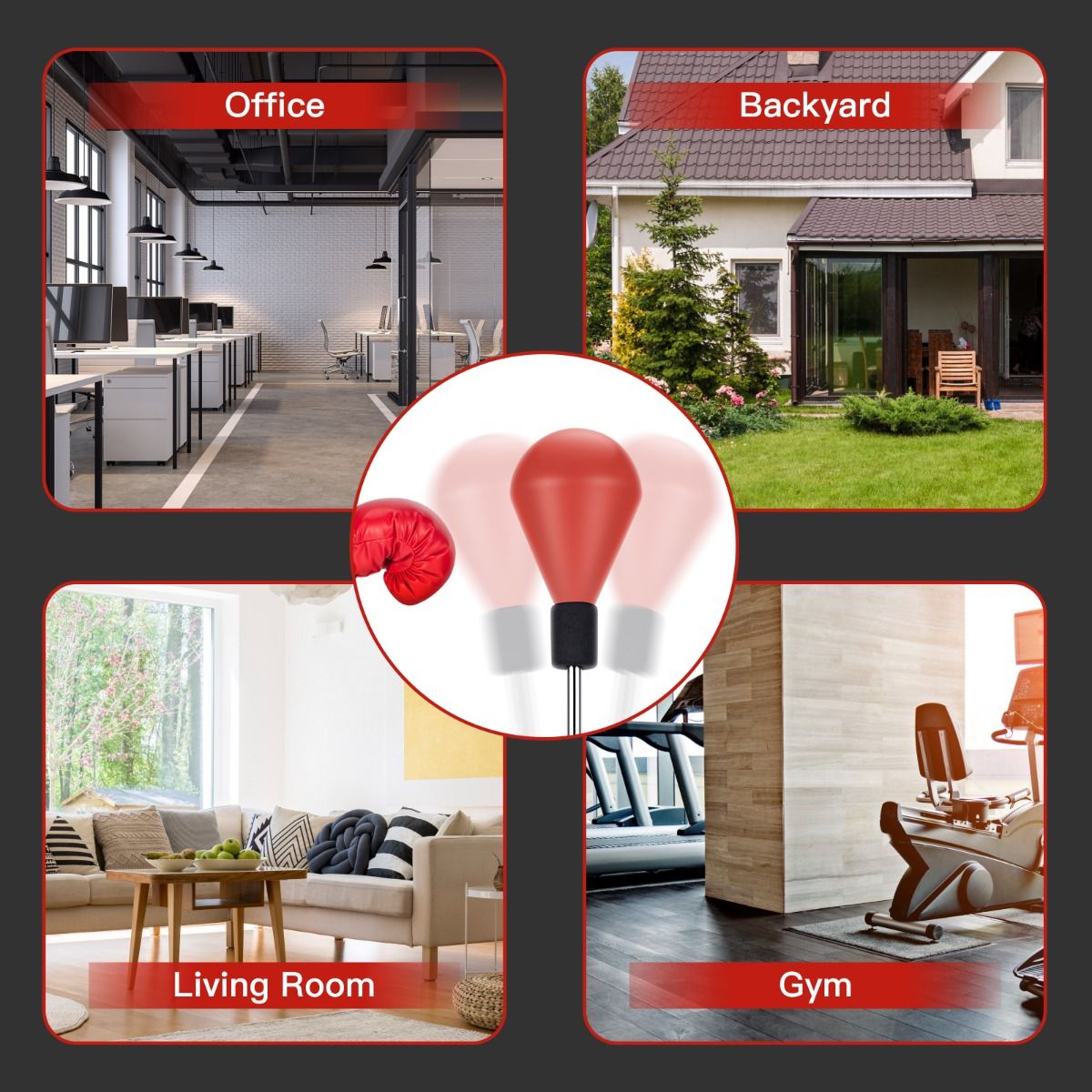 The freestanding punching bag with stand is a good fitness program suitable for the whole family without going out. 4-position height adjustment aims to reduce the height limit of users and meet the needs of people of different ages. The durable base can hold up to 28L of water or 32kg of sand for stability. The additional 6 suction cups maximize the stability, no matter what kind of ground can bring excellent performance. The integrated PU material features good impact resistance, which can serve for a long time. Breathable gloves can protect your hands from feeling stuffy. When you are not using it, the boxing ball can be stored in the base and can be easily moved through handles. If you are looking for a freestanding punching bag like this, do not hesitate to place an order! Integrated PU and High-quality Spring: Compared with most PVC boxing balls on the market, this high-grade punching bag is made of integrated PU, which is more impact-resistant and durable. The high-quality spring is dedicated to ensuring that it can quickly return to its original position after each punch. 4-Level Adjustable Heights: The boxing bag with stand features a 4-level adjustment function, allowing you to freely choose between the heights of 140/146/152/158cm. Both kids and adults can quickly find the height that suits them to ensure the best boxing training experience. Firm Base and 6 Suction Cups: The base of this reflex bag can be filled with 28L of water or 32kg sand to increase stability. Other than that, the base is designed with 6 suction cups to ensure that it can be kept in place on various grounds such as lawn, wooden floor, tiled floor, carpet and more during fitness. Breathable Gloves and Convenient Transportation: The included boxing gloves feature small holes to achieve the effect of ventilation and bring a better user experience. The bottom of the base can store boxing ball to facilitate storage. The recessed design on both sides of the base acts as the handle in order to increase the convenience of transportation. Wide Applications: When you feel tired after working for a long time, this boxing training equipment is the best choice to help you release stress. If you want to have a healthier body, the punching bag can help you exercise and fitness. Needless to say, for professional athletes, this boxing ball can help you improve your skills. Besides, boxing can keep children active and enhance hand-eye coordination.