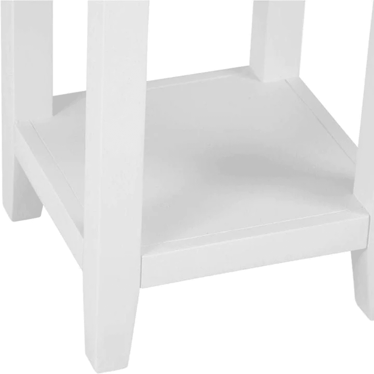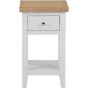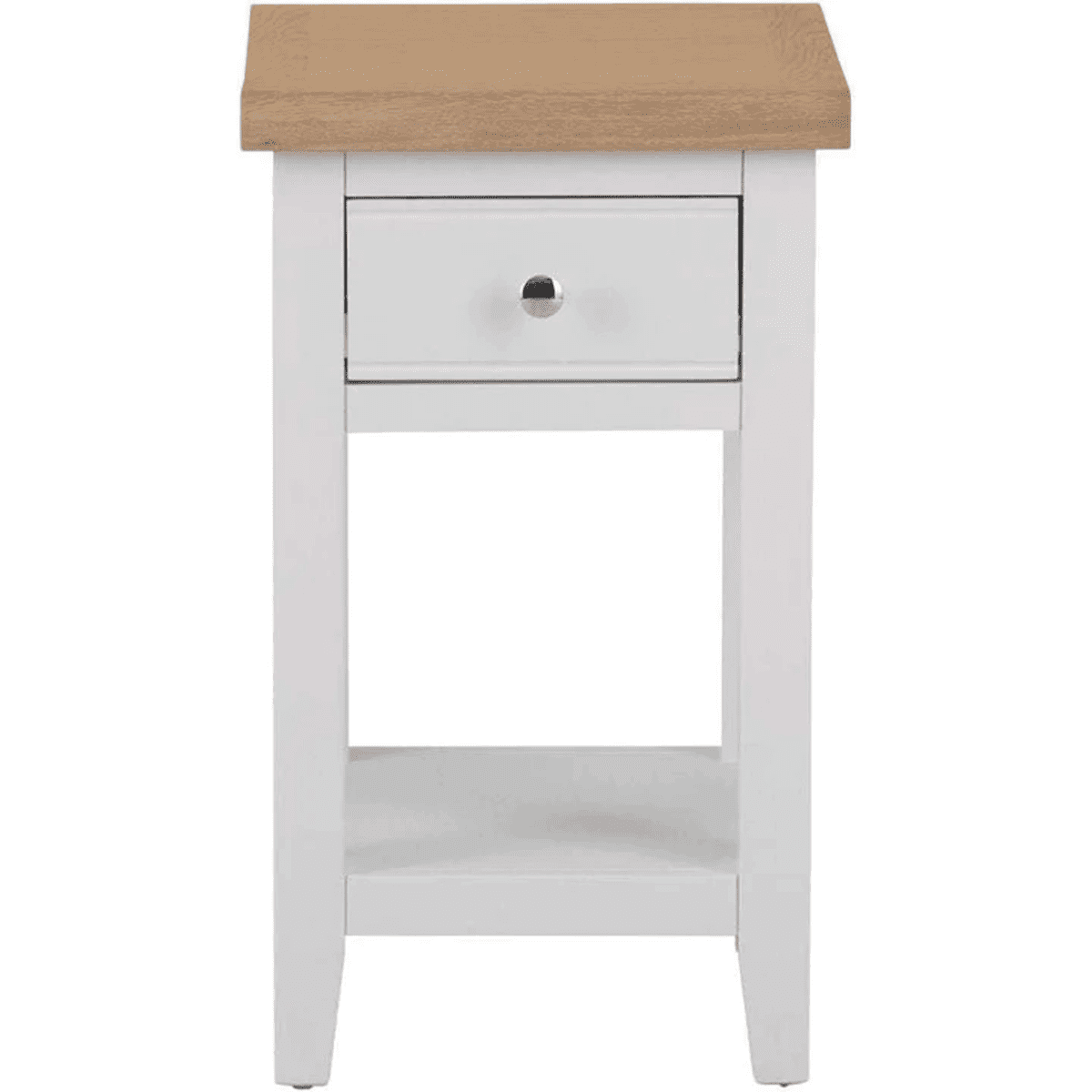 Elevate your home decor with the Quantum 1 Drawer Lamp Table featuring an oak top in a stylish white finish. This lamp table comes fully assembled and showcases elegant tapered legs along with a convenient storage shelf. With its chic chrome handles, it's the perfect combination of style and functionality.
