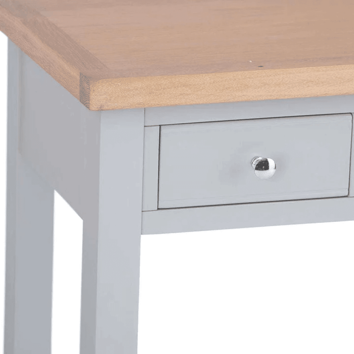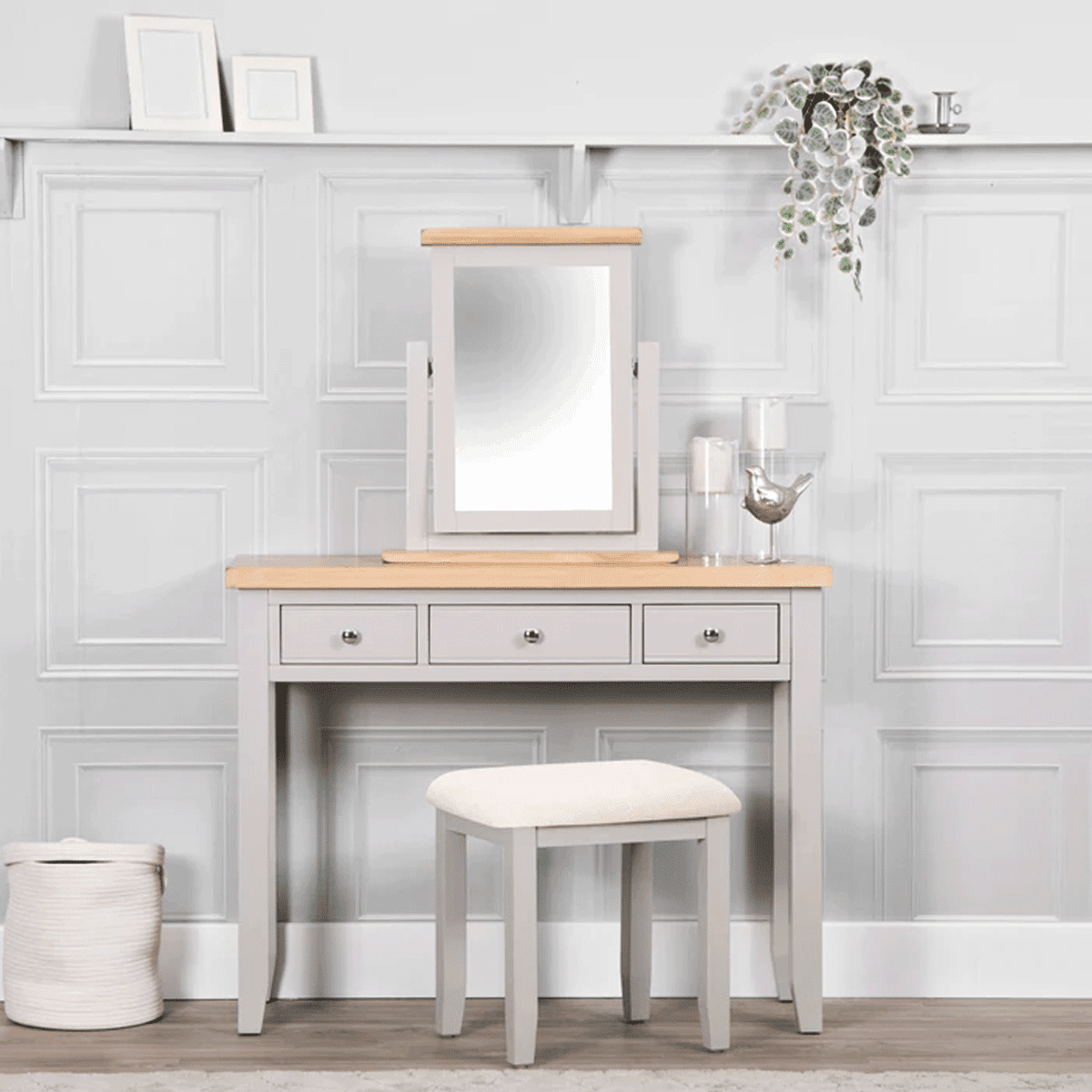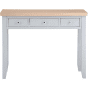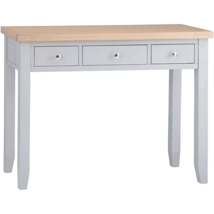 Upgrade your bedroom with the Quantum 3 Drawer Dressing Table featuring an oak top in a stylish grey finish. While assembly is required, this dressing table boasts chrome cup handles, offering a perfect blend of style and functionality.