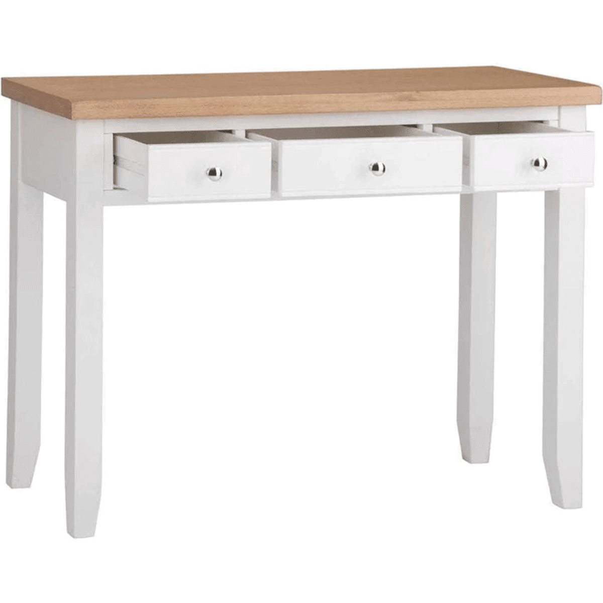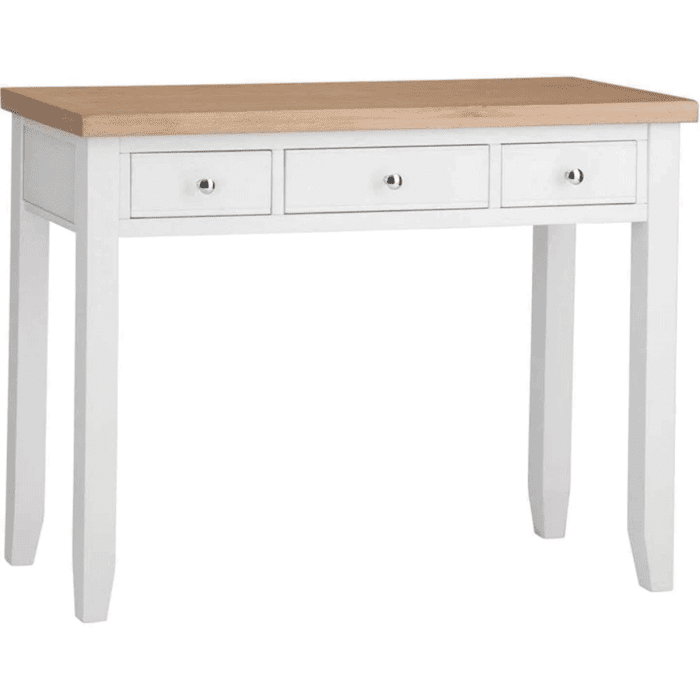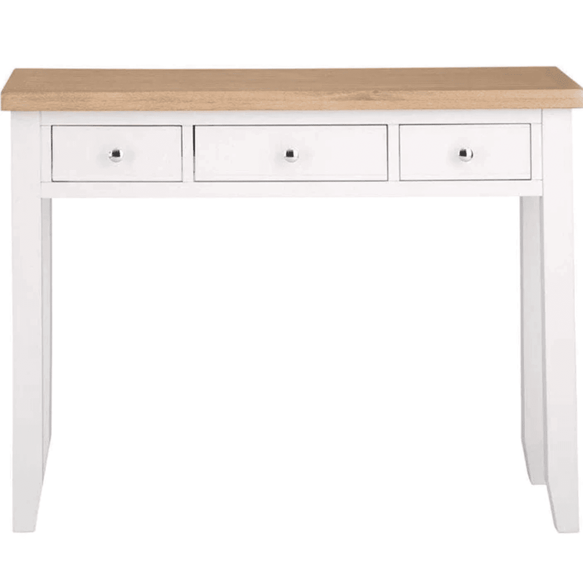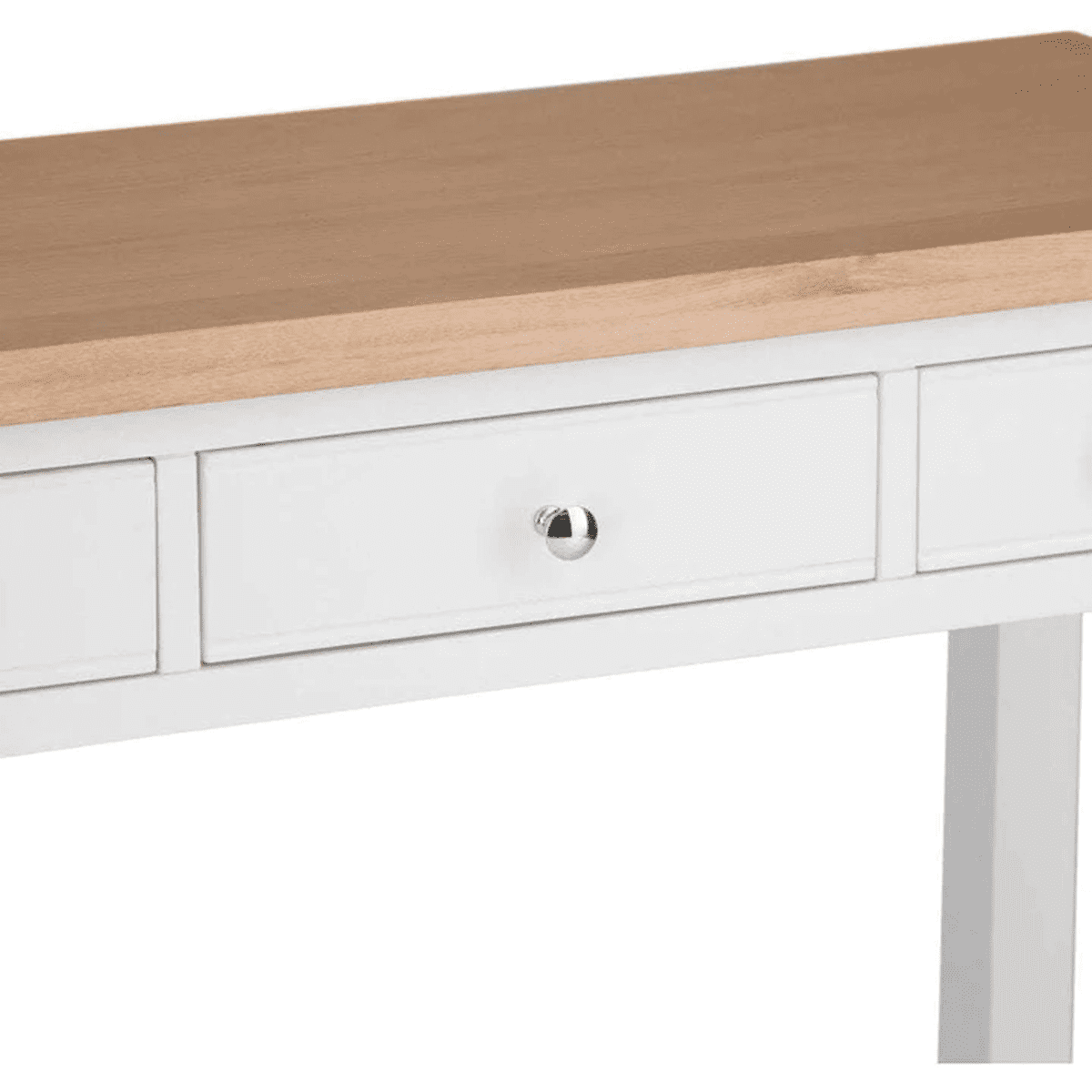 Upgrade your bedroom with the Quantum 3 Drawer Dressing Table featuring an oak top in a stylish white finish. While assembly is required, this dressing table boasts chrome cup handles, offering a perfect blend of style and functionality.