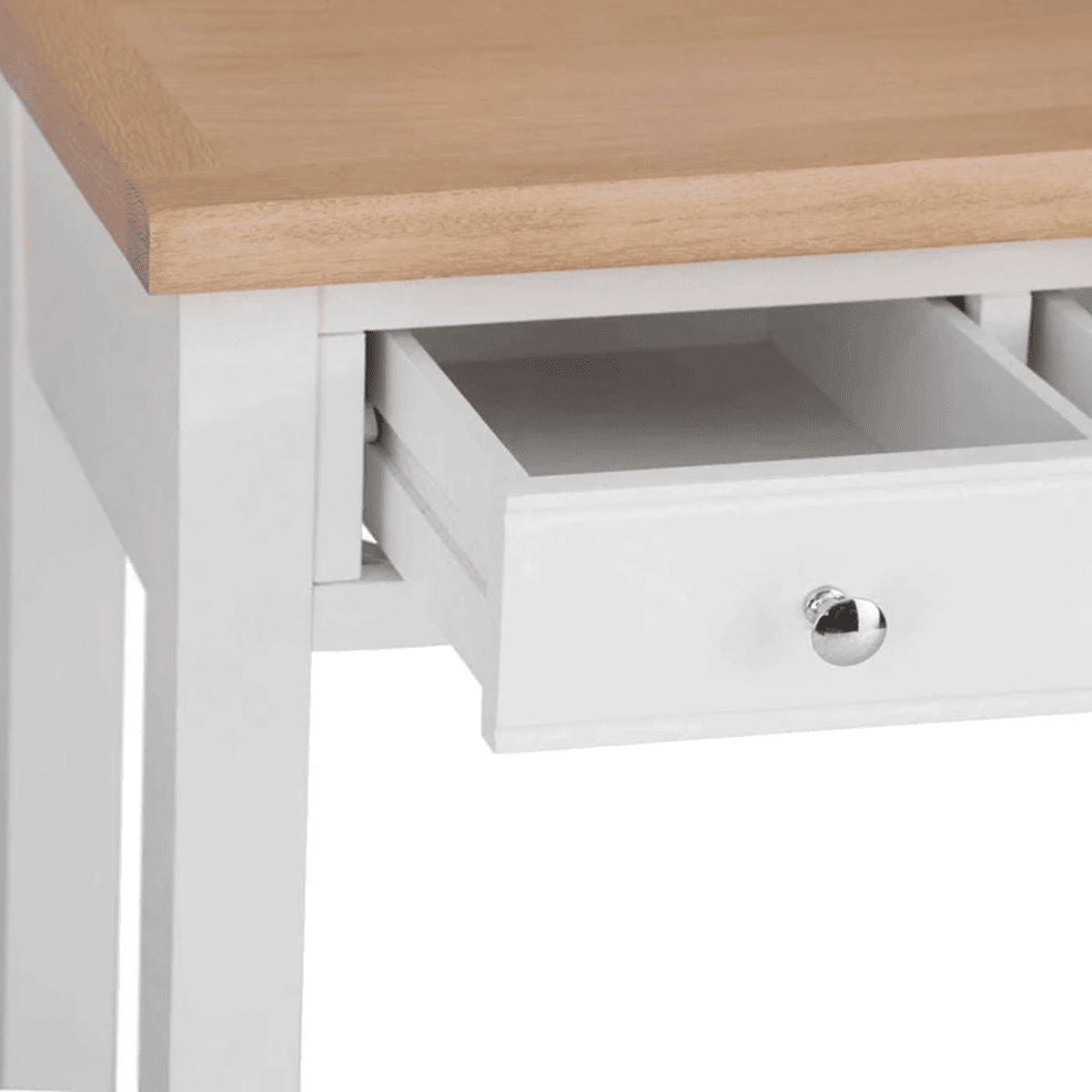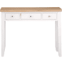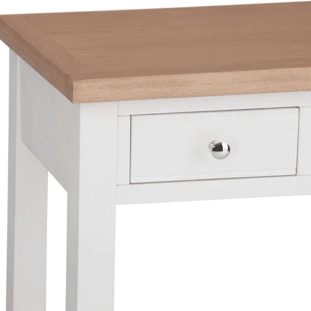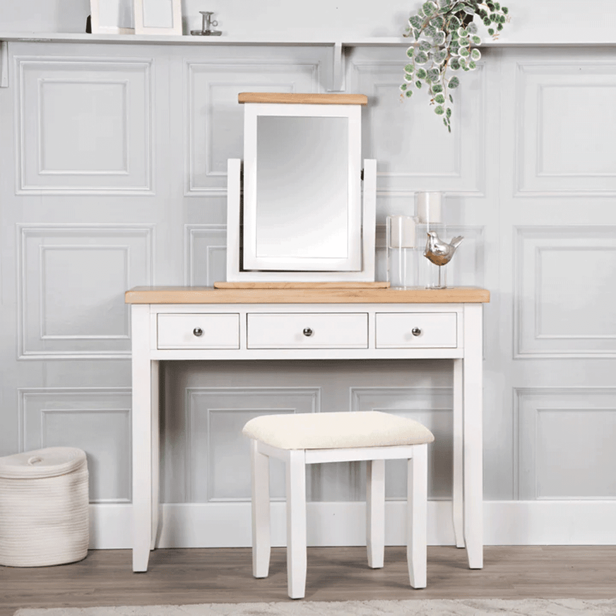 Upgrade your bedroom with the Quantum 3 Drawer Dressing Table featuring an oak top in a stylish white finish. While assembly is required, this dressing table boasts chrome cup handles, offering a perfect blend of style and functionality.