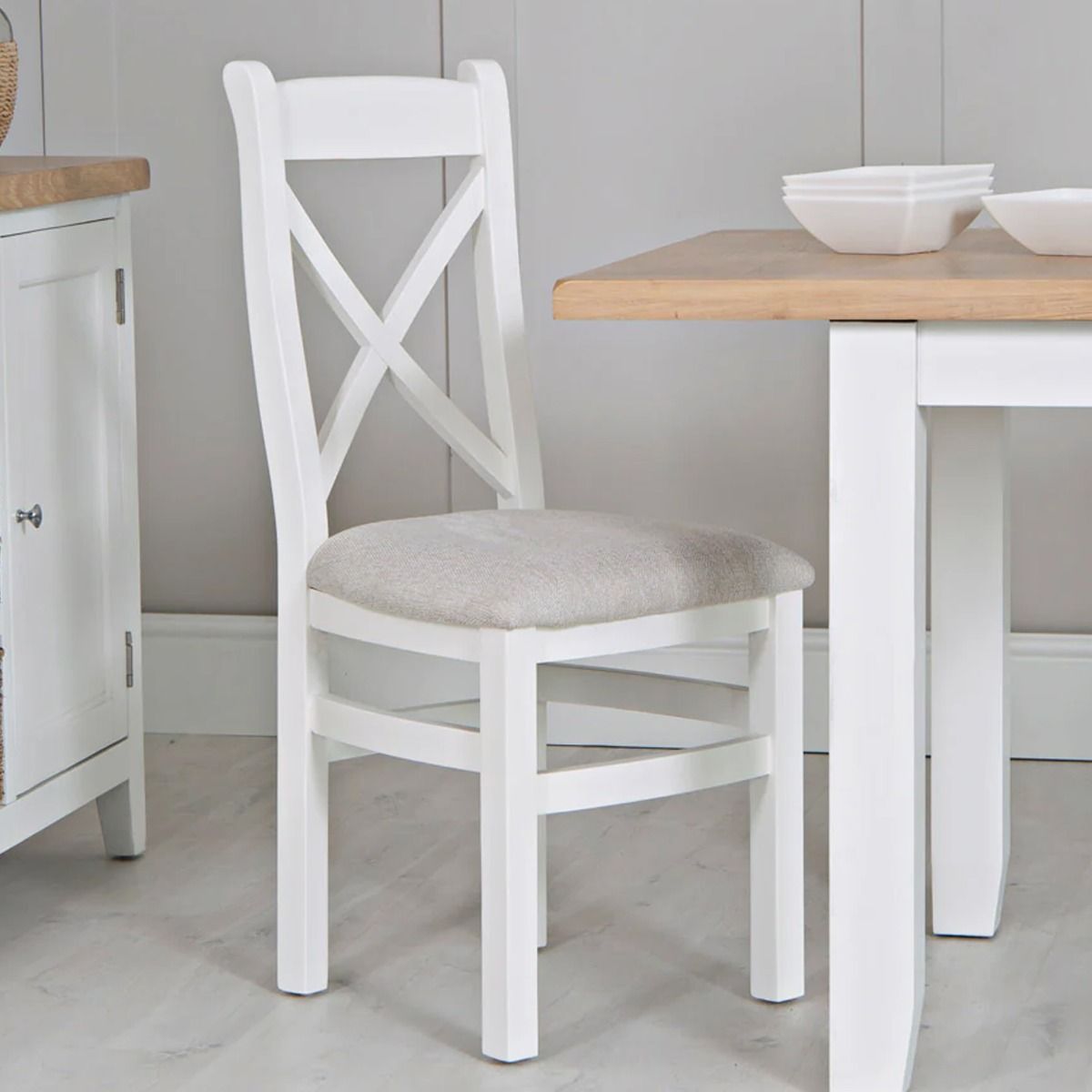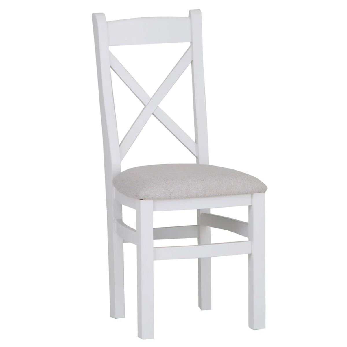Elevate your dining space with the Quantum Cross Back Cushioned Seat Dining Chair in White. This stylish chair features a cross back design, cushioned seat for comfort, and high backrest for support, perfect for adding a classic yet contemporary touch to your home.