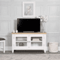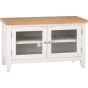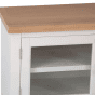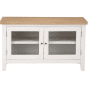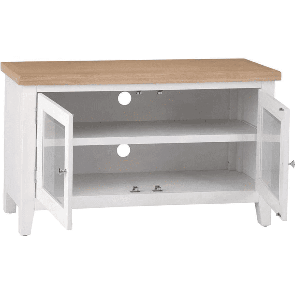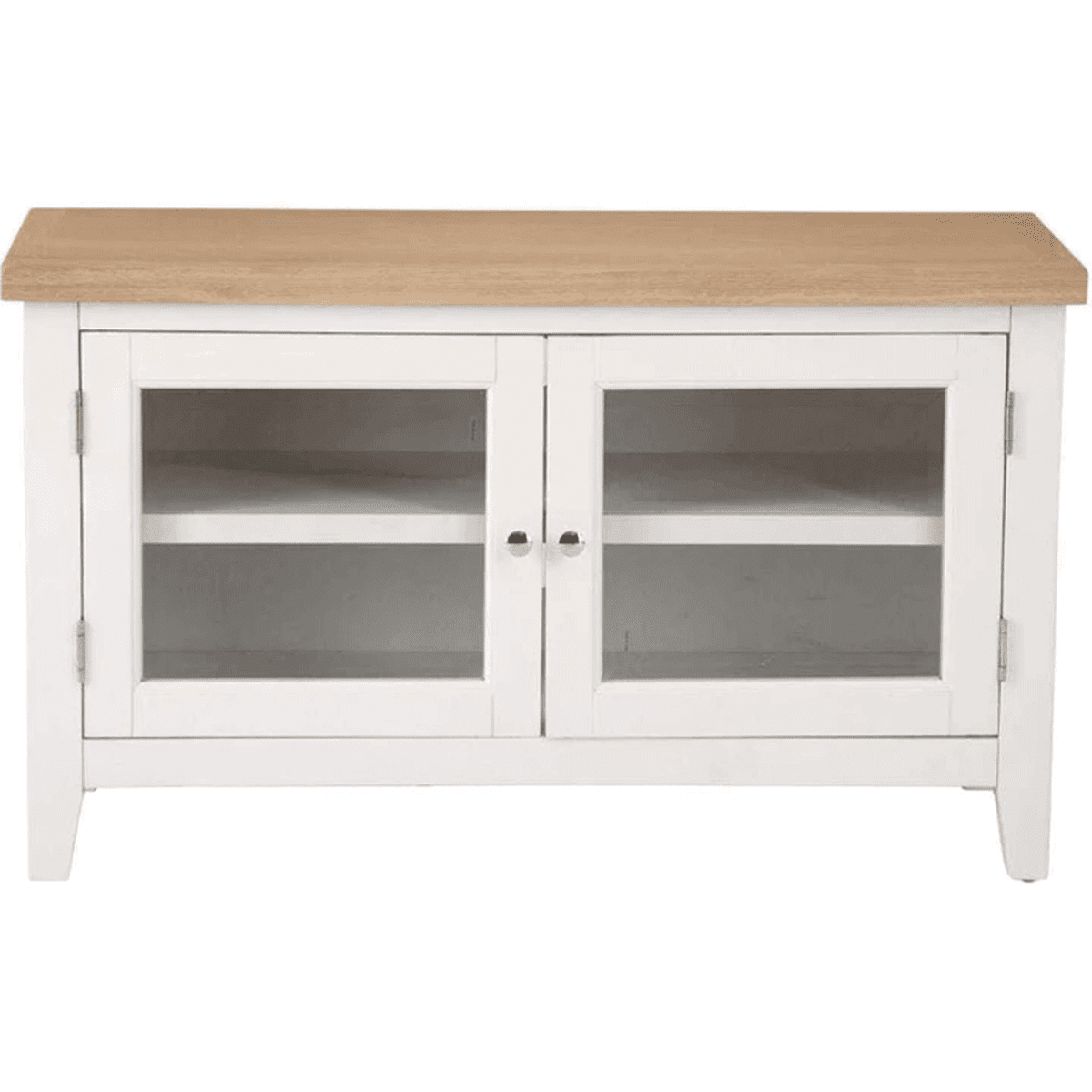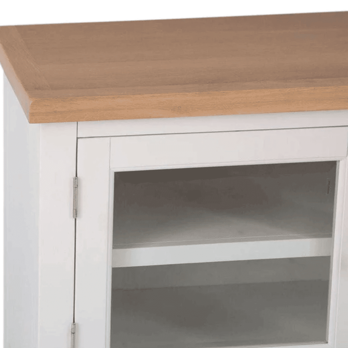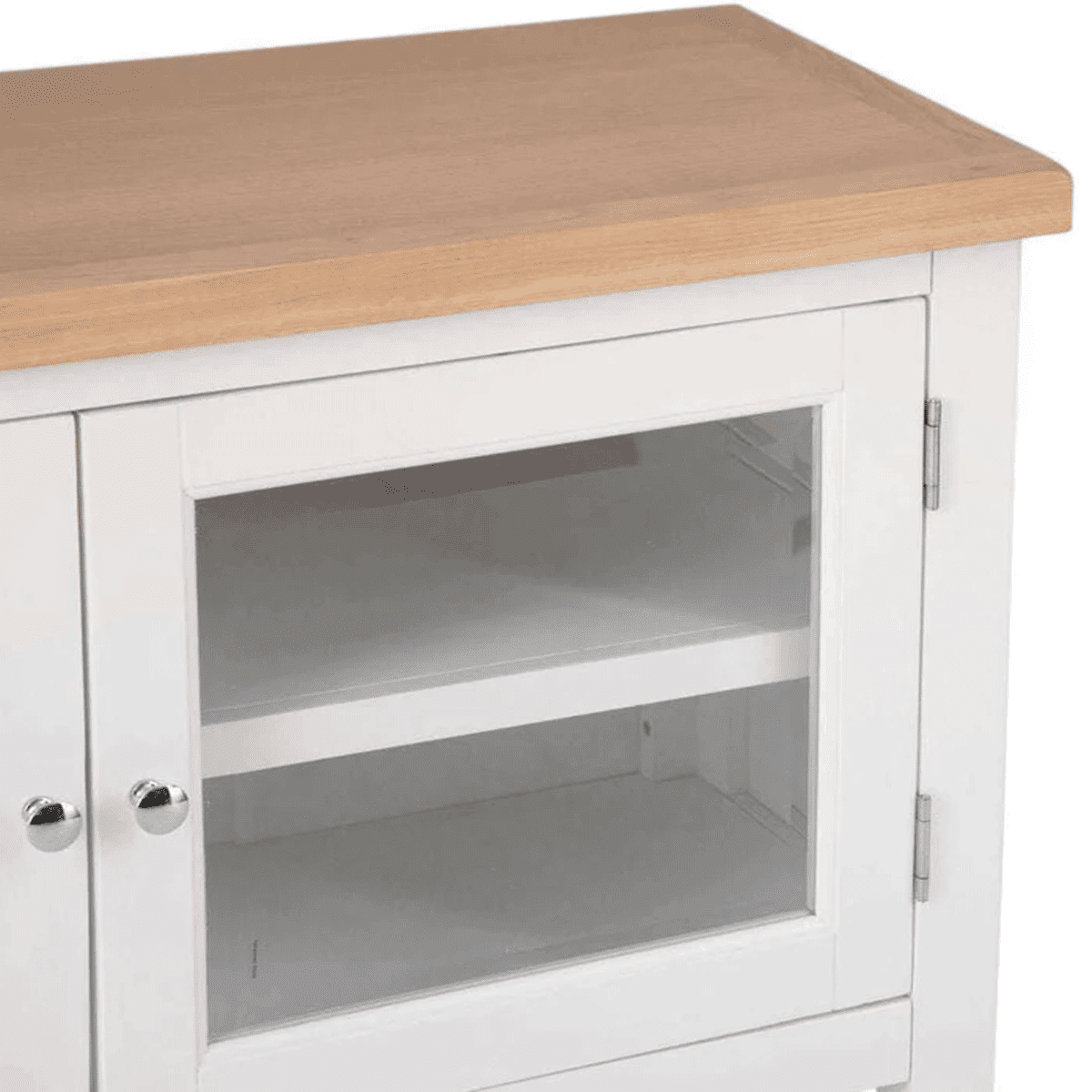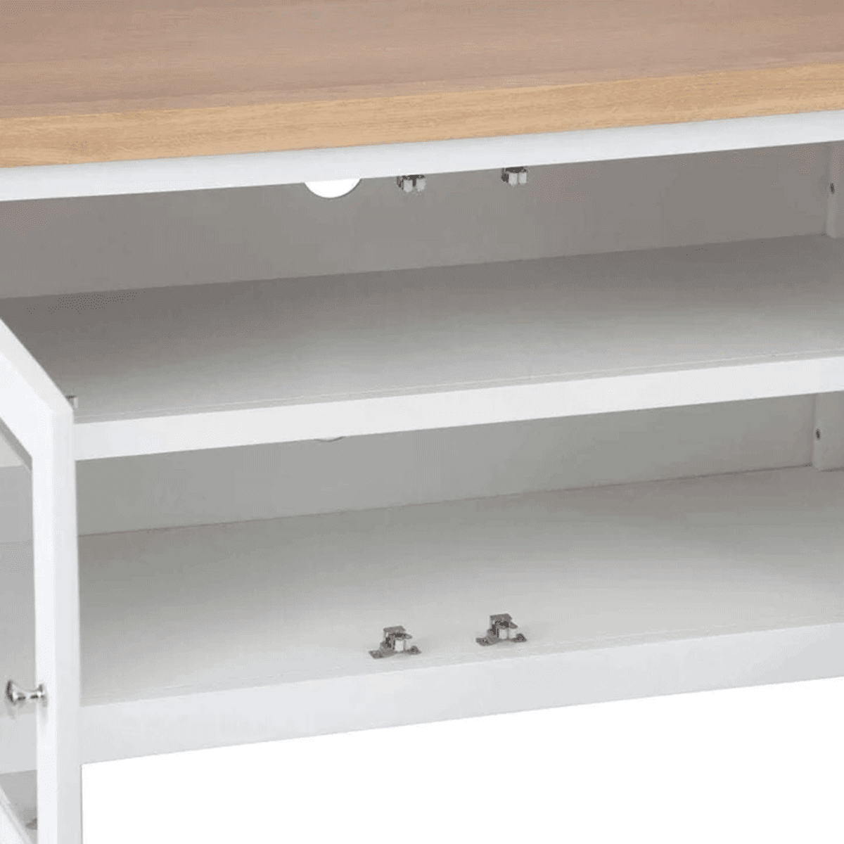 Upgrade your living room with the Quantum Glazed Standard TV Unit, featuring a stylish combination of white and oak finishes. This TV unit requires no assembly, offers a glazed cabinet, convenient cable holes in the back, and features a sleek chrome knob, combining both form and function effortlessly.