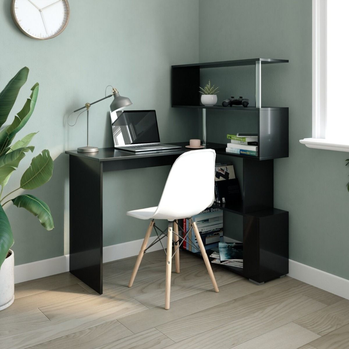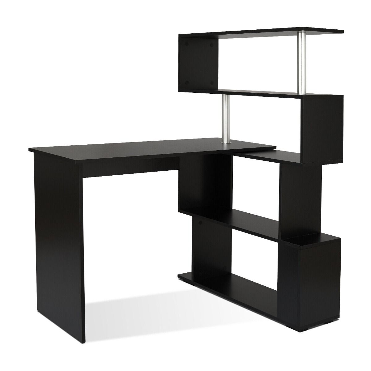 Revolutionize your workspace with the Quantum L Shaped Corner Desk featuring 360° Rotatable Shelves in sleek black. Ideal for offices, bedrooms, or studies, this desk maximizes space with its innovative rotating shelf design. The expansive work surface accommodates computers, monitors, and printers, while the 4-tier S-shaped shelf provides ample storage for books, folders, and more. Crafted from durable E1 grade particleboard and stainless steel, it boasts a modern appearance, simple structure, and easy assembly.