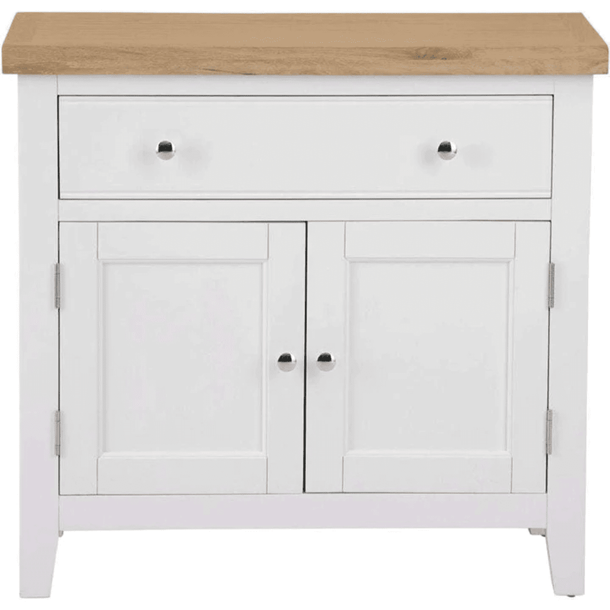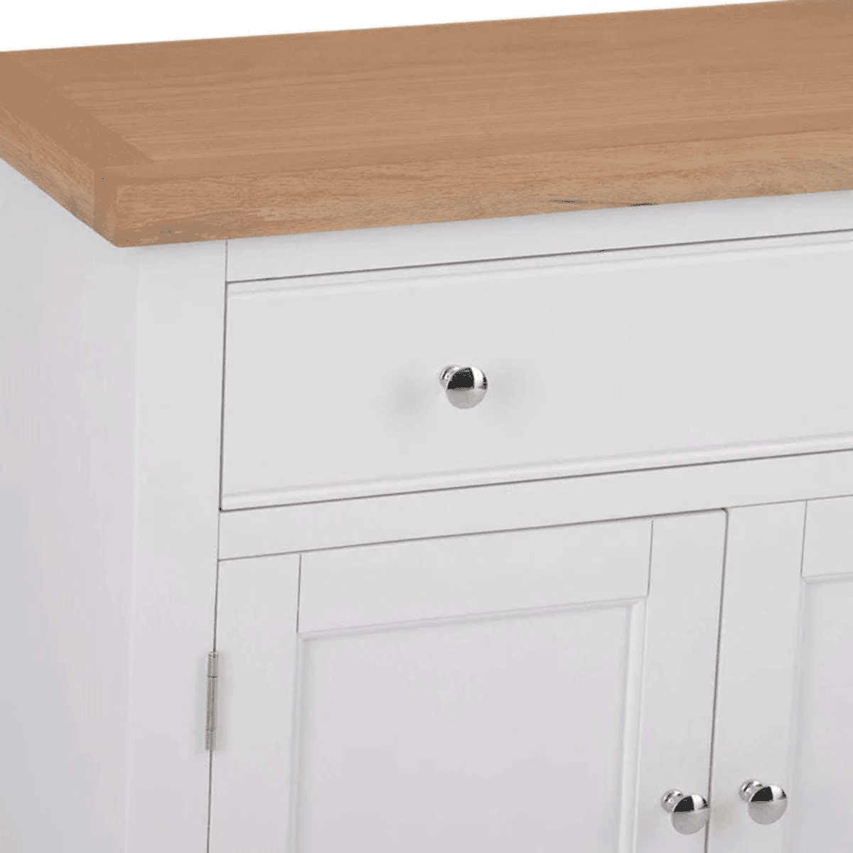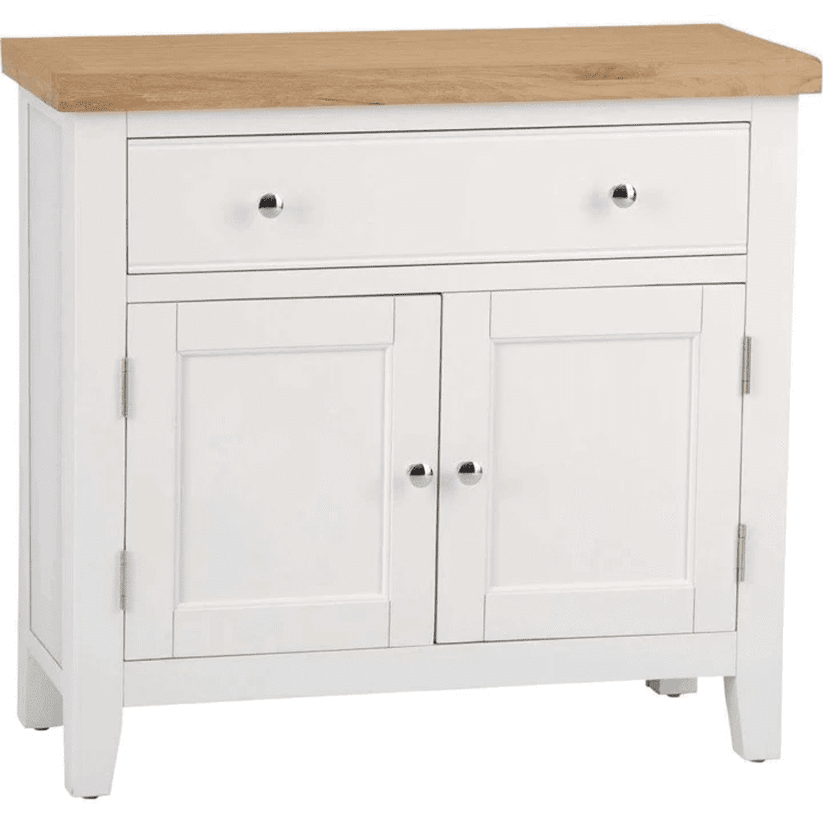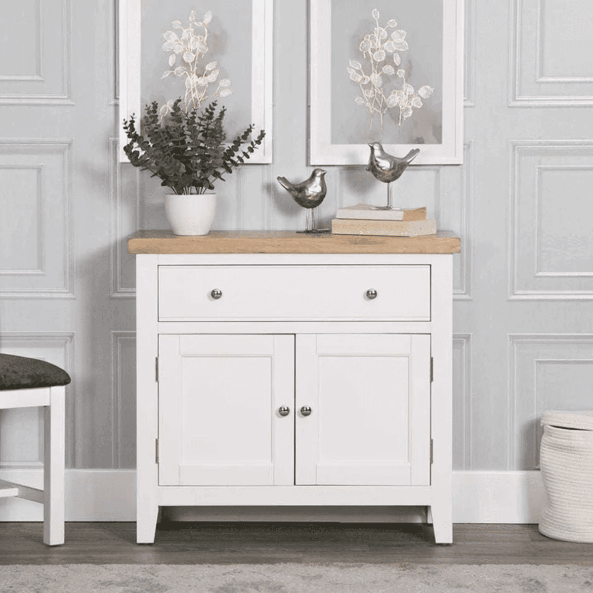 Enhance your home decor with the Quantum Small Sideboard featuring an oak top in a stylish white finish. This sideboard comes fully assembled, showcasing a dovetailed drawer on wooden guides and chrome handles, all within a compact and space-efficient design.