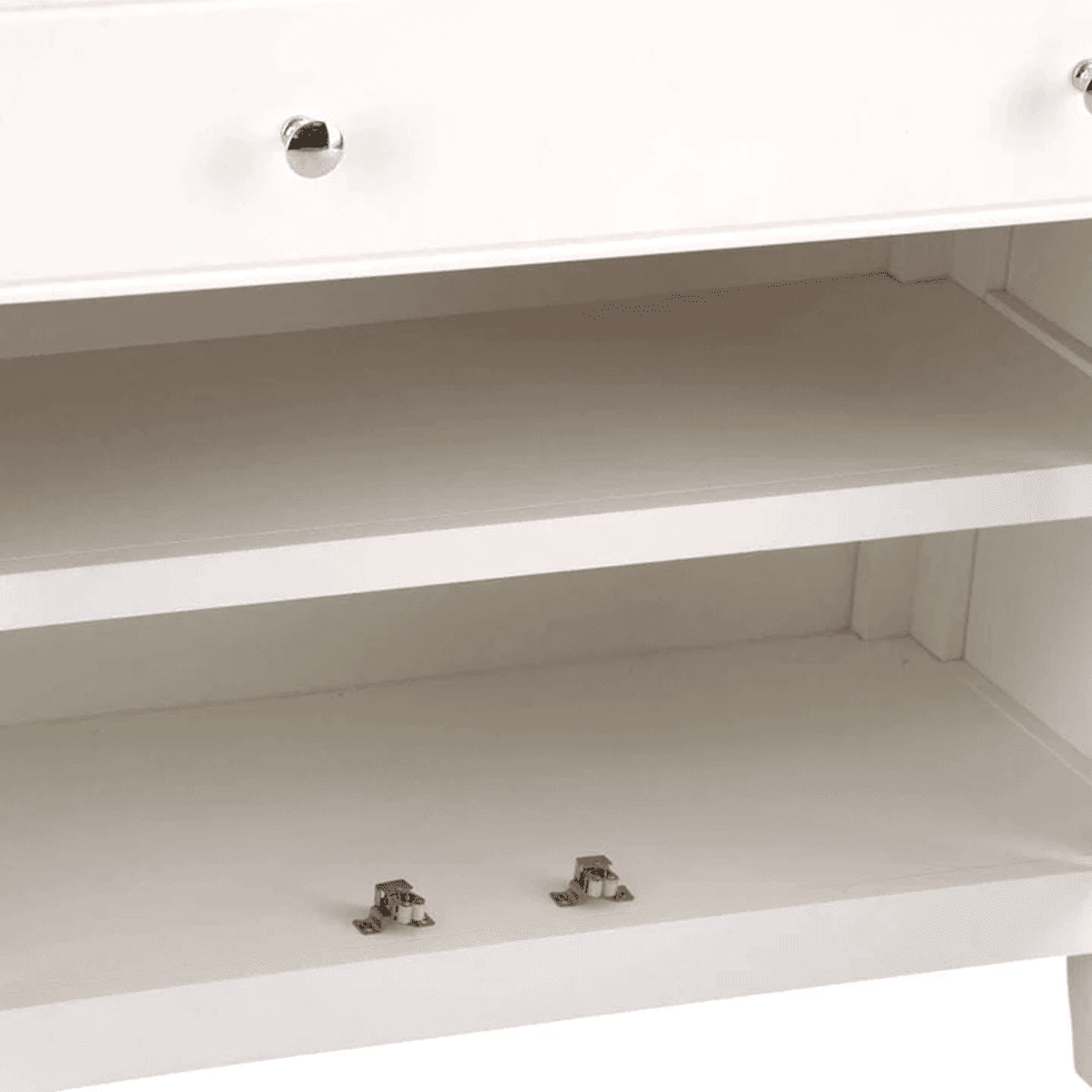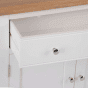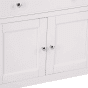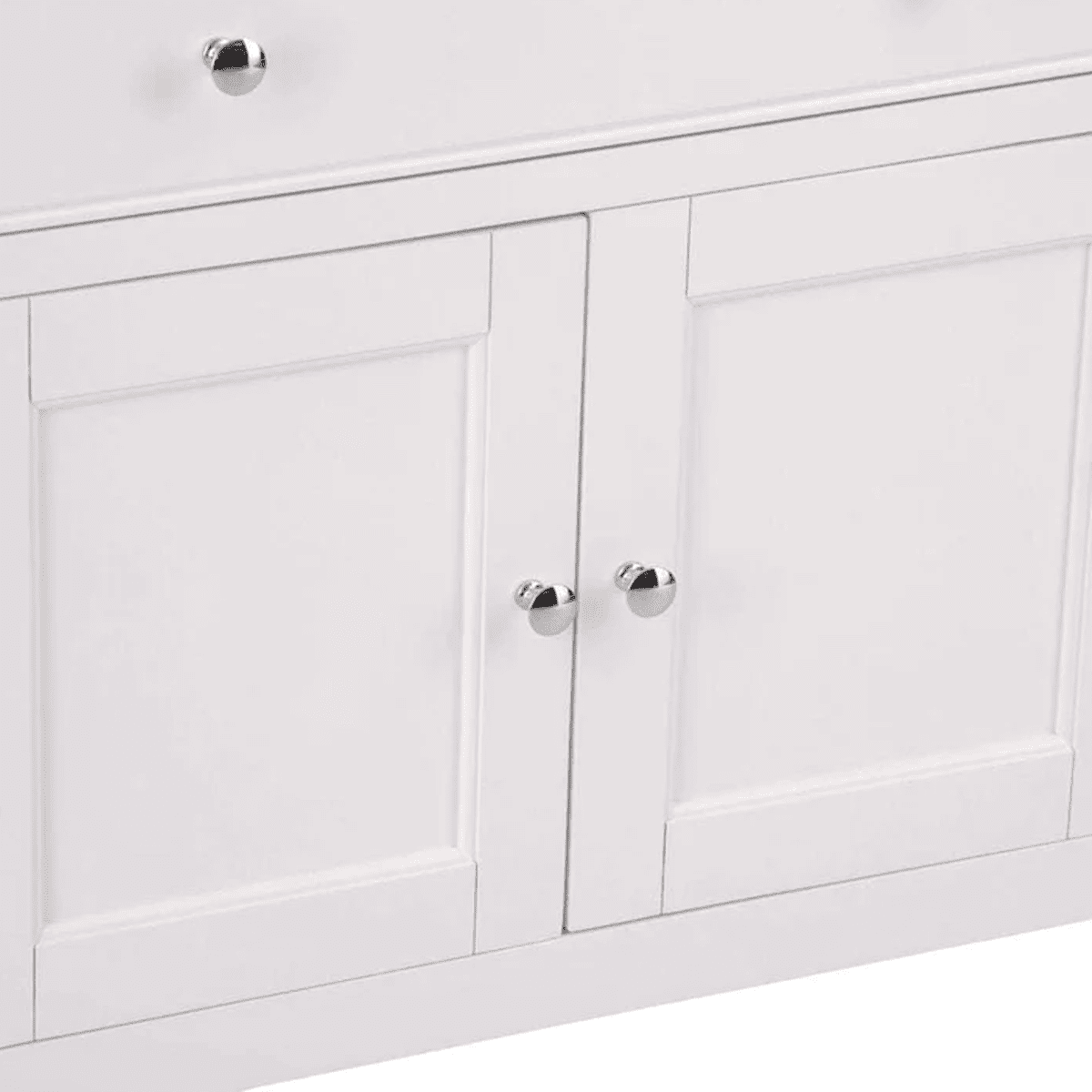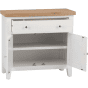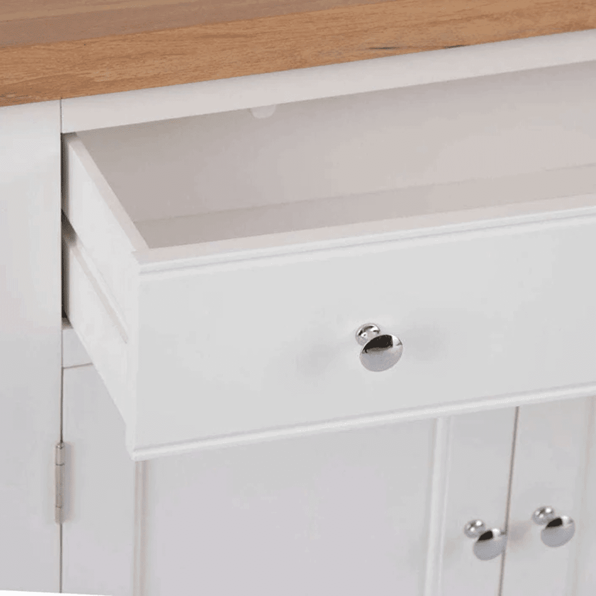 Enhance your home decor with the Quantum Small Sideboard featuring an oak top in a stylish white finish. This sideboard comes fully assembled, showcasing a dovetailed drawer on wooden guides and chrome handles, all within a compact and space-efficient design.
