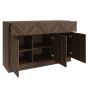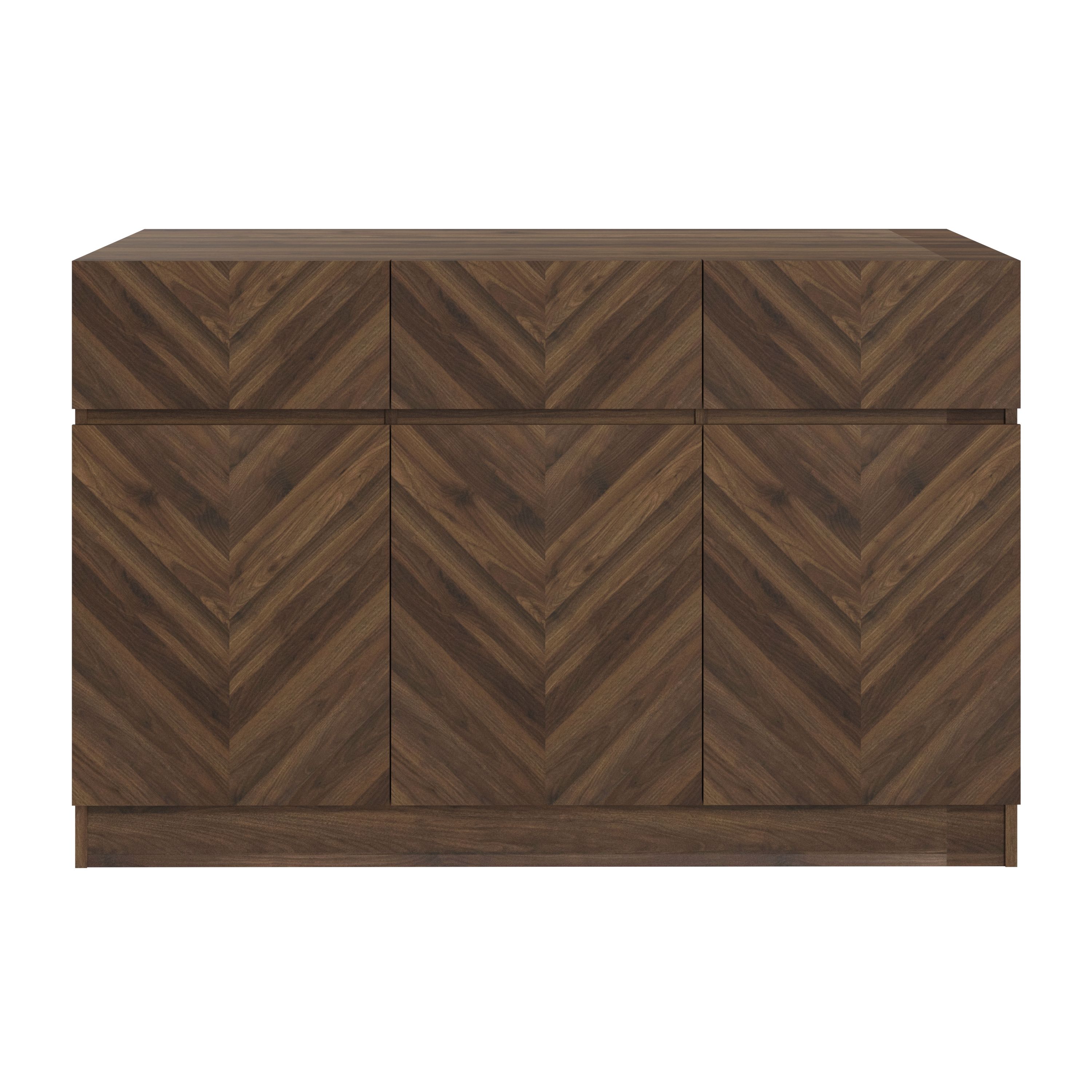 Are you looking for a sleek and modern storage solution for your home Look no further than our stunning sideboard. Crafted with clean lines and a minimalist design, this piece features notches on the edges that serve as handles, eliminating the need for unsightly hardware. With three spacious drawers and three doors boasting herringbone inspired wood-grain finishes in Walnut colour, this large sideboard provides ample storage space for your belongings while adding a touch of sophistication to your decor. Whether youre looking to declutter your living room, dining room, or bedroom, this versatile piece is sure to meet your needs. Dont miss out on the opportunity to elevate your homes style with our stunning sideboard.