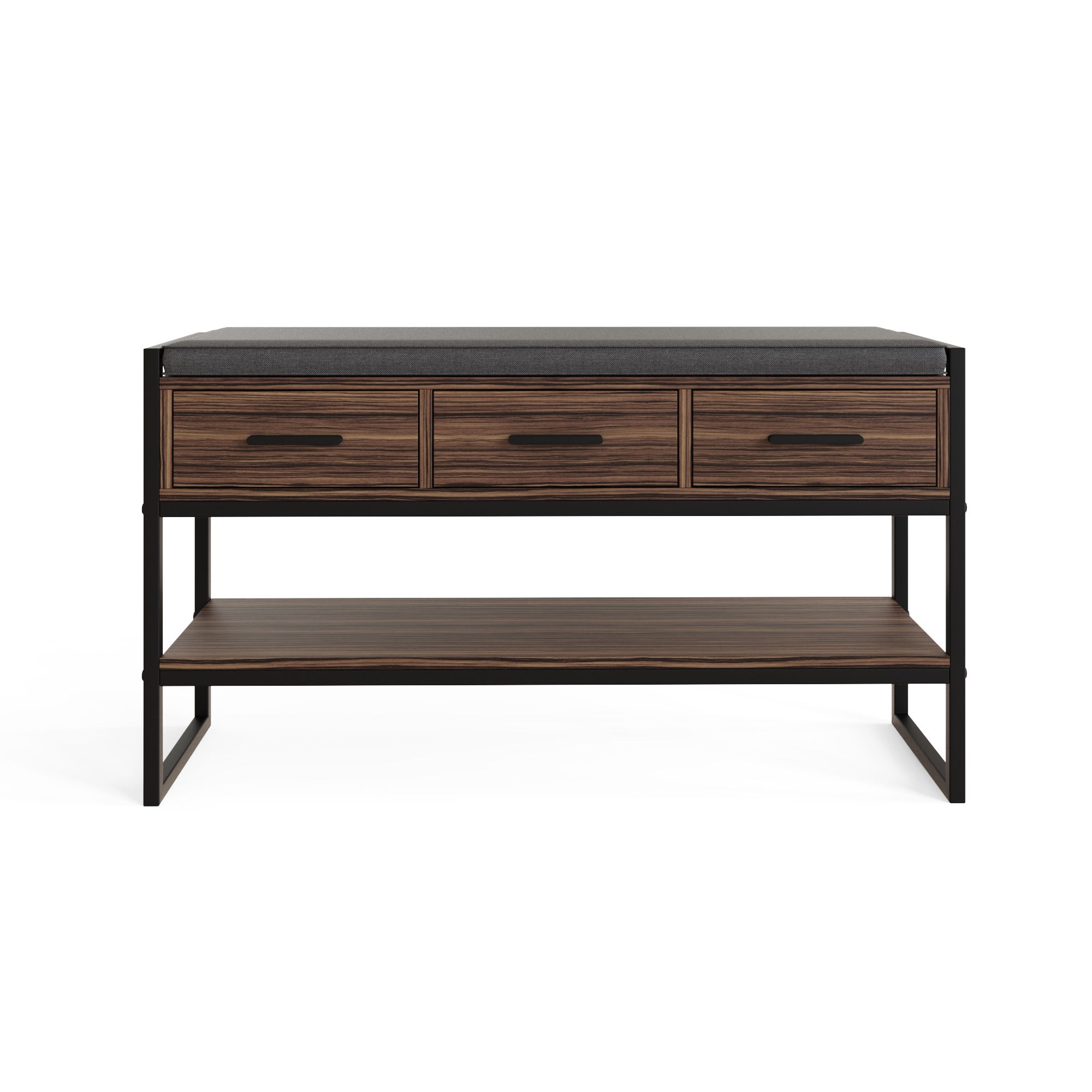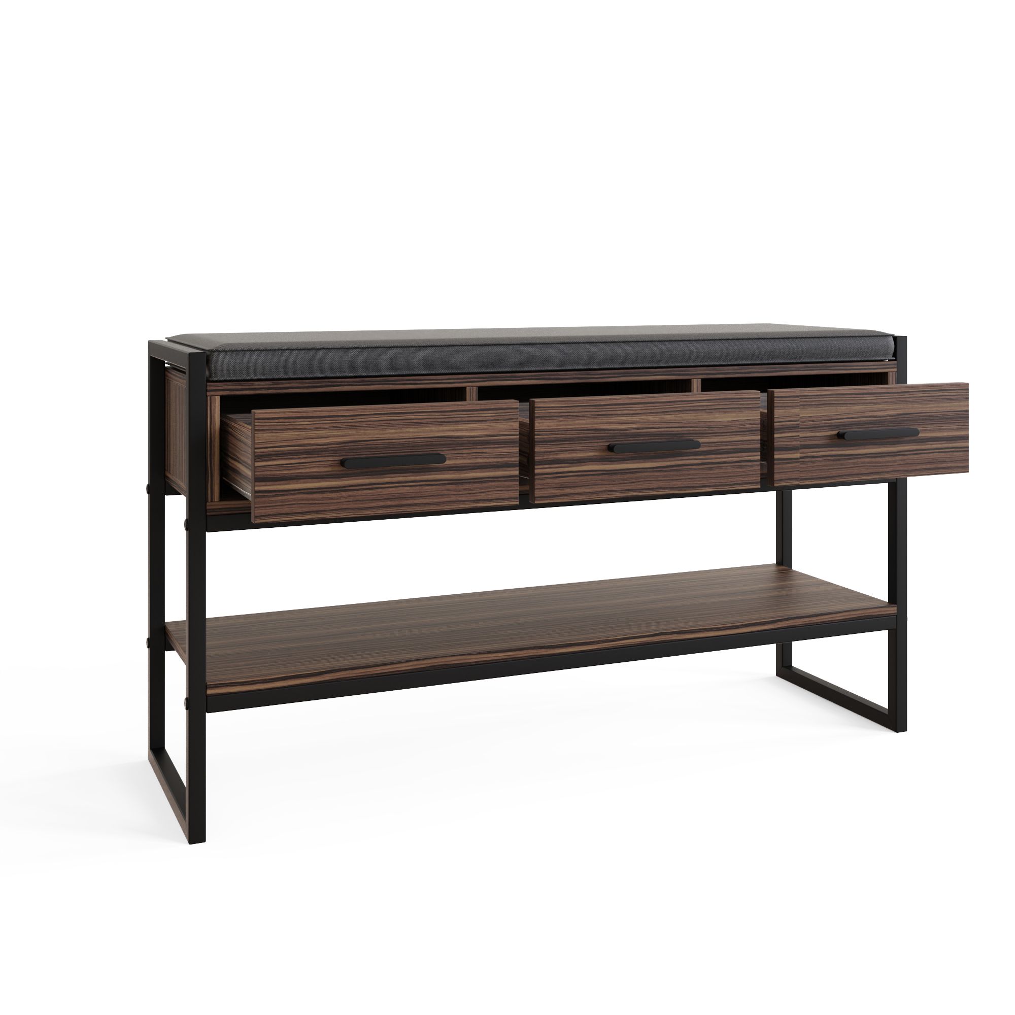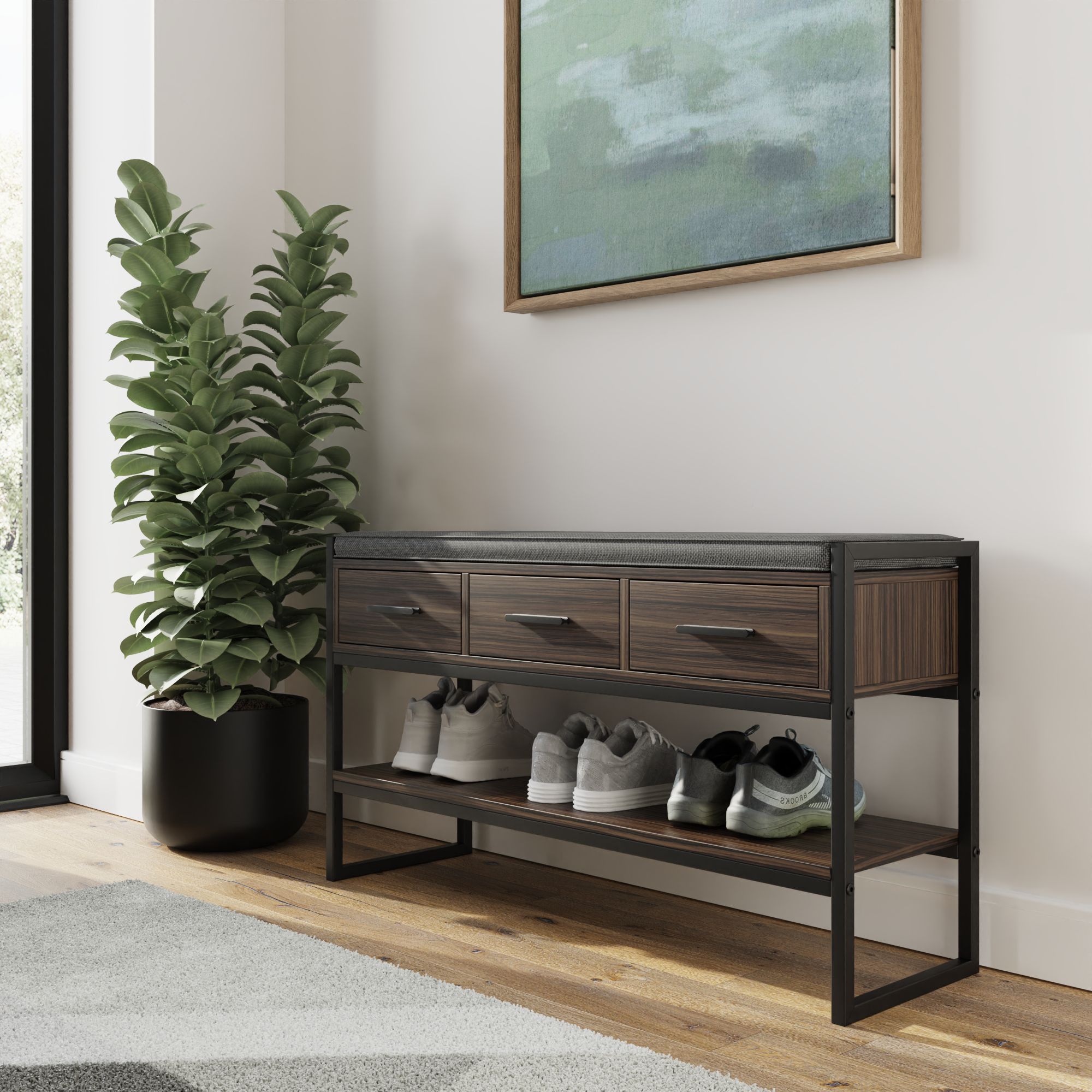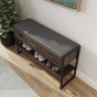 QUILO Dark Oak Shoe Bench - Medium-sized, 4 Pair Storage, 3 Drawers, Cushioned Seat, Metal Frame