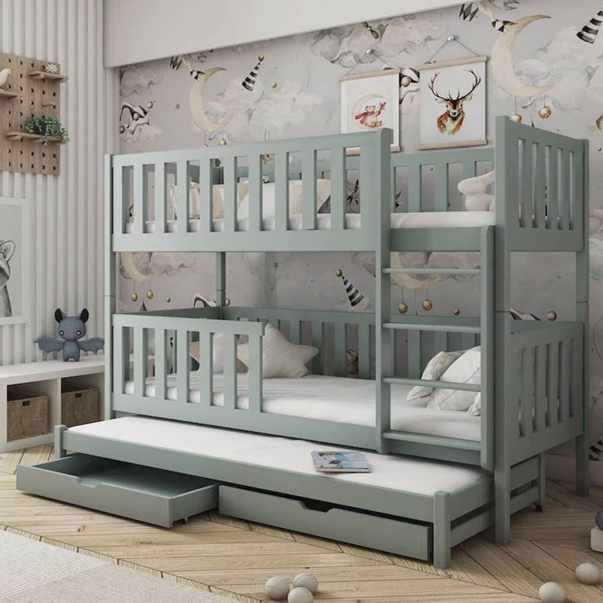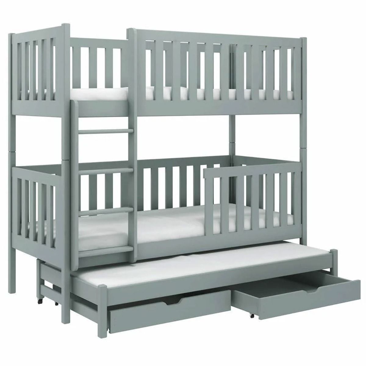 Introducing the Quinx Bunk Bed – a stylish and versatile addition to your child's space. Crafted from solid pine wood, this bed not only promises durability but also ensures your child's safety with non-removable safety guards. The universal ladder offers flexibility, while the three-layered water-based paint guarantees a health-conscious choice. This bunk bed effortlessly transforms into three separate beds, providing adaptability for growing needs. With a slatted pinewood base, under-bed storage, and a trundle bed designed for a foam mattress, it's a perfect blend of comfort, style, and practicality.