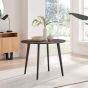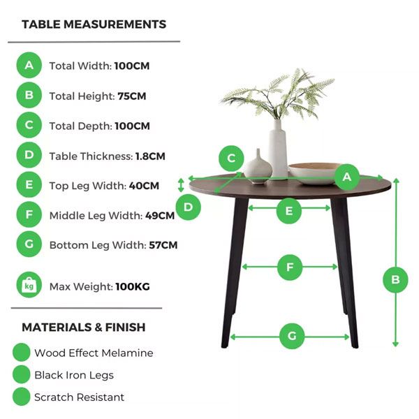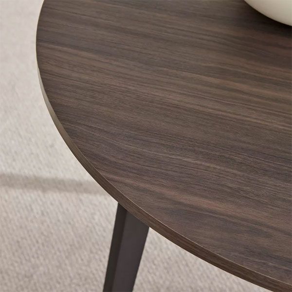 Introducing the Quiteria range, a sleek and modern collection of furniture offered by Home Done. The Quiteria walnut wood effect round dining table with black legs is an ideal choice for any contemporary dining space. With a 100cm diameter, it is compact enough for smaller rooms while still providing ample space for family meals or entertaining guests. The dark walnut-effect top combined with elegantly tapered black legs brings a touch of sophistication and industrial flair. Constructed from strong wood composite covered in a durable, scratch-resistant walnut wood melamine veneer, and supported by four sturdy iron legs powder-coated in black, this table is designed to last. Its minimalist design and Scandi-Industrial inspiration make it a versatile piece that can adapt to evolving trends, adding dimension and style to your dining area. Pair it with modern dining chairs for a chic, contemporary look suitable for any home.