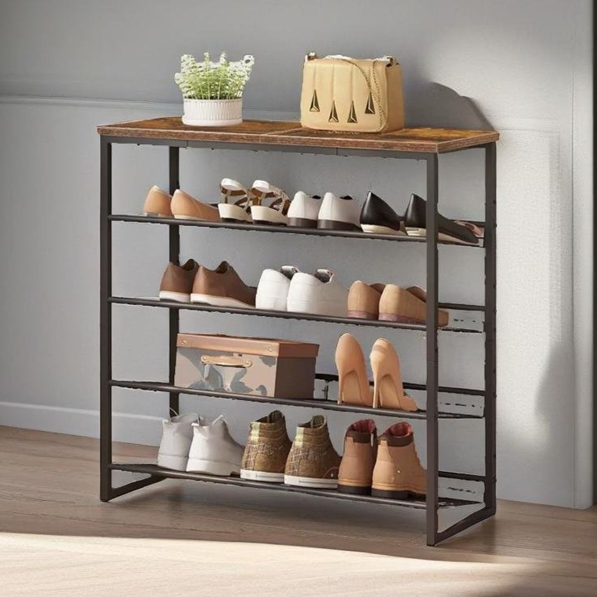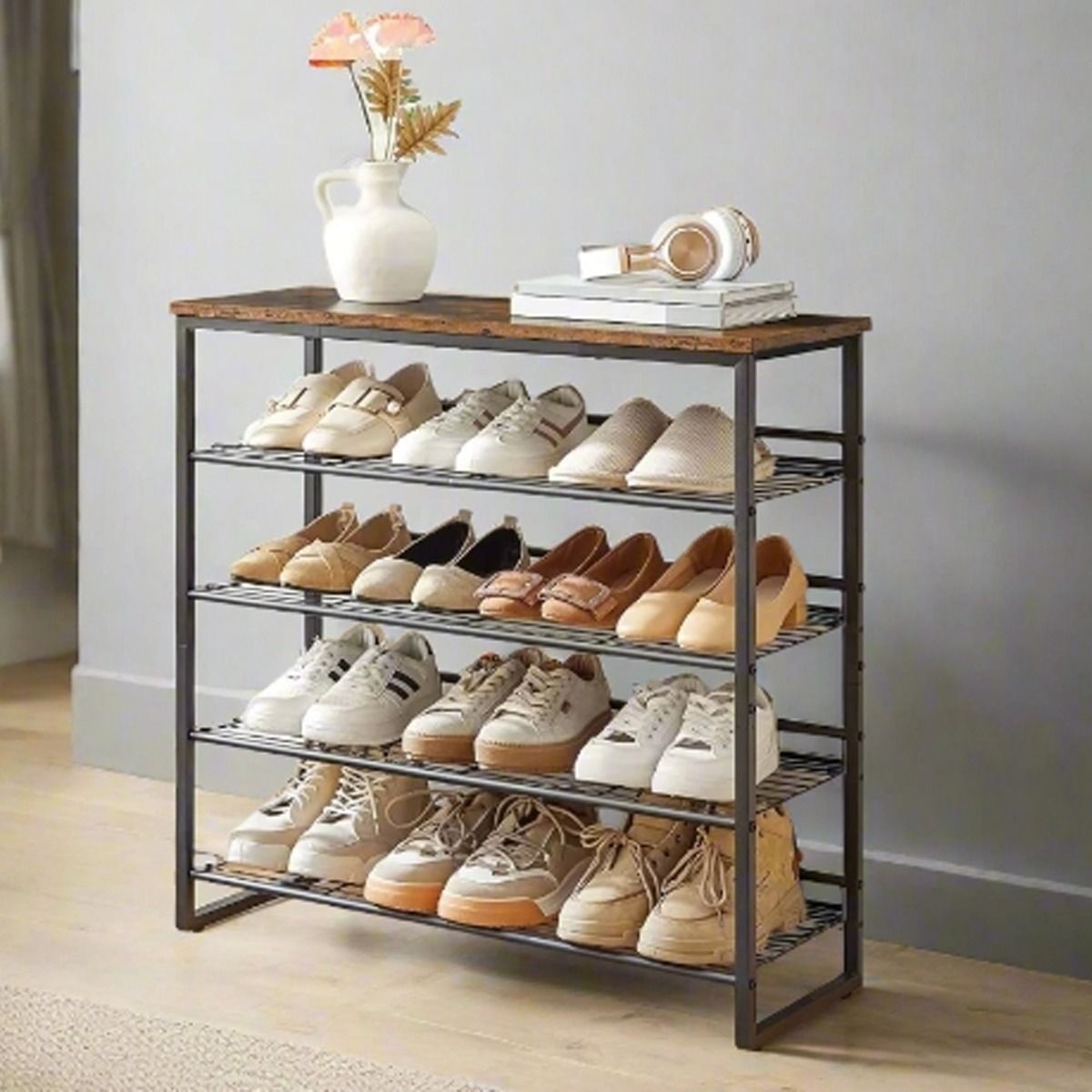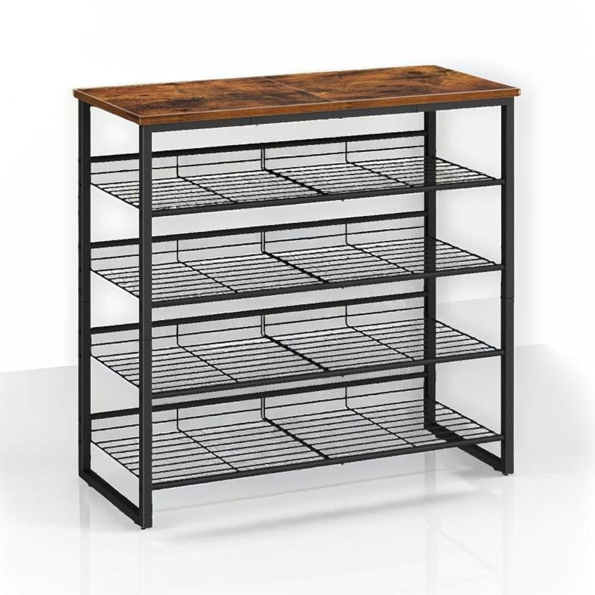 QUIVANTE 5-Tier Shoe Rack with Adjustable Wire Shelves - Rustic Brown and Black