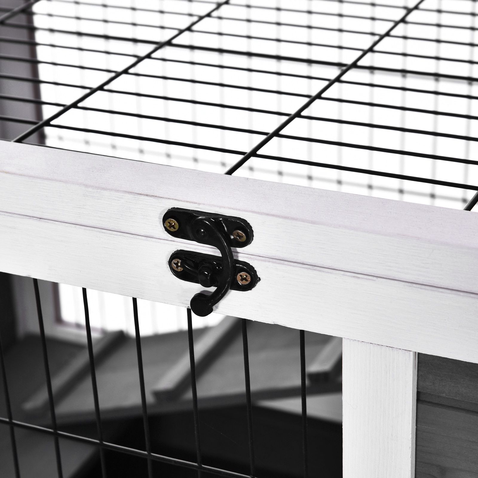 - EASY ACCESS: Opening roof, combined with the secure doors and pull-out tray to get inside to clean and give your pet food, with mesh write all around for security. FOUR WHEELS: Allows the hutch to be moved around easily. Two can be locked to keep in place when needed.