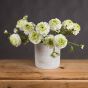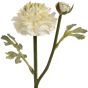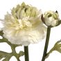 A single stem white and green ranunculous spray comprising one open flower head, one flower bud and ranunculous leaves on a textured stem