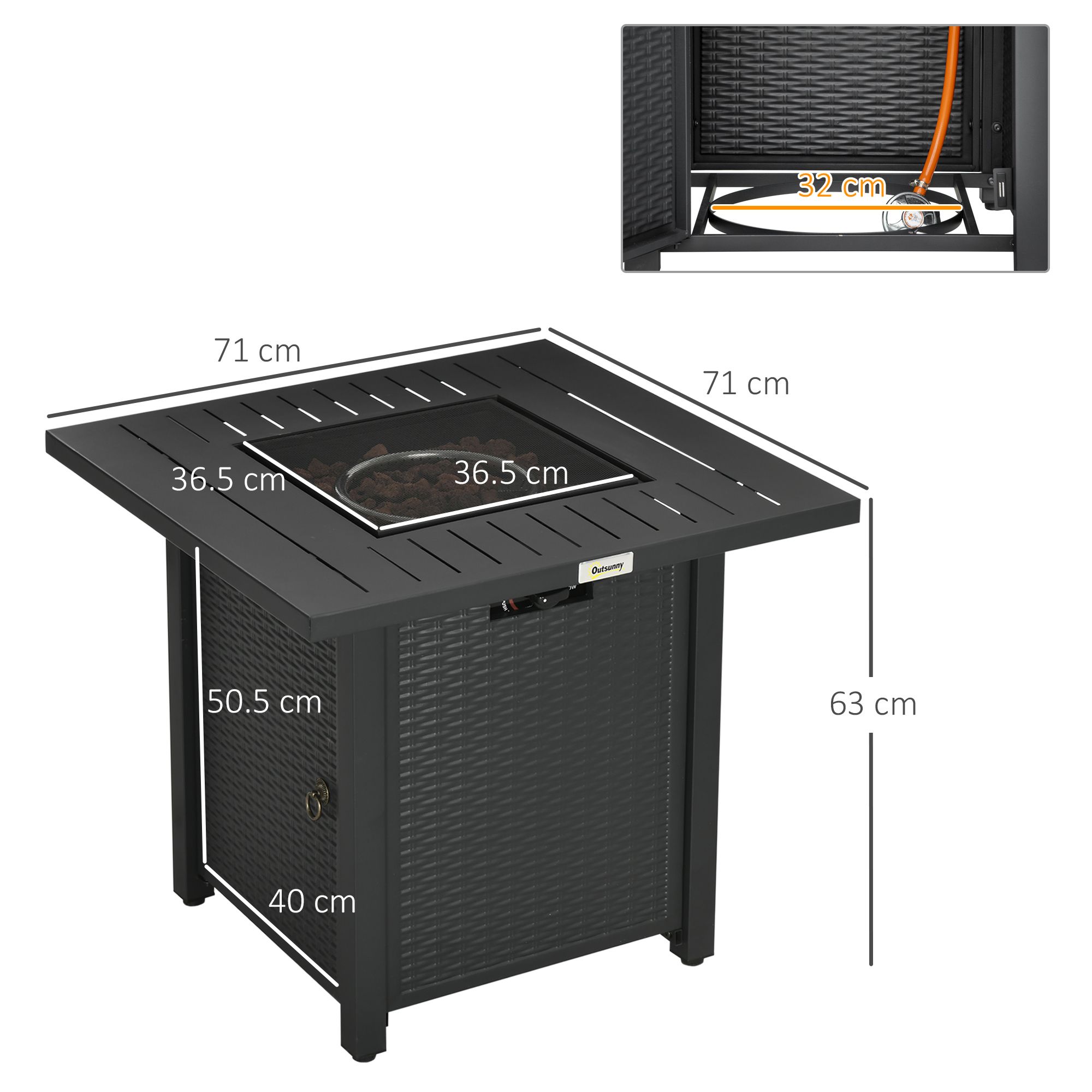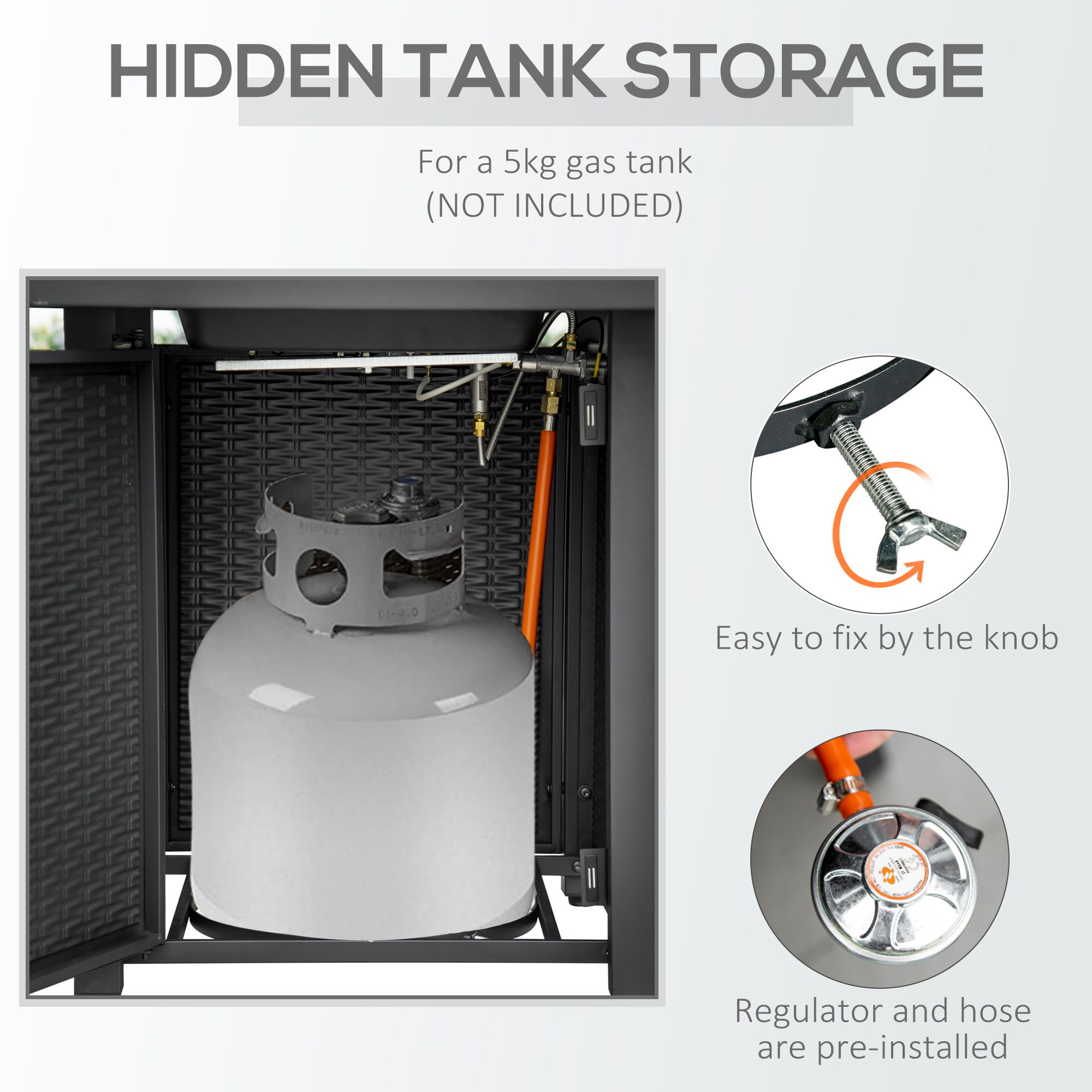 - Overall dimension: 71L x 71W x 63H cm. Regulator and hose are pre-installed for your convenience. Need a 5kg propane tank but NOT included.