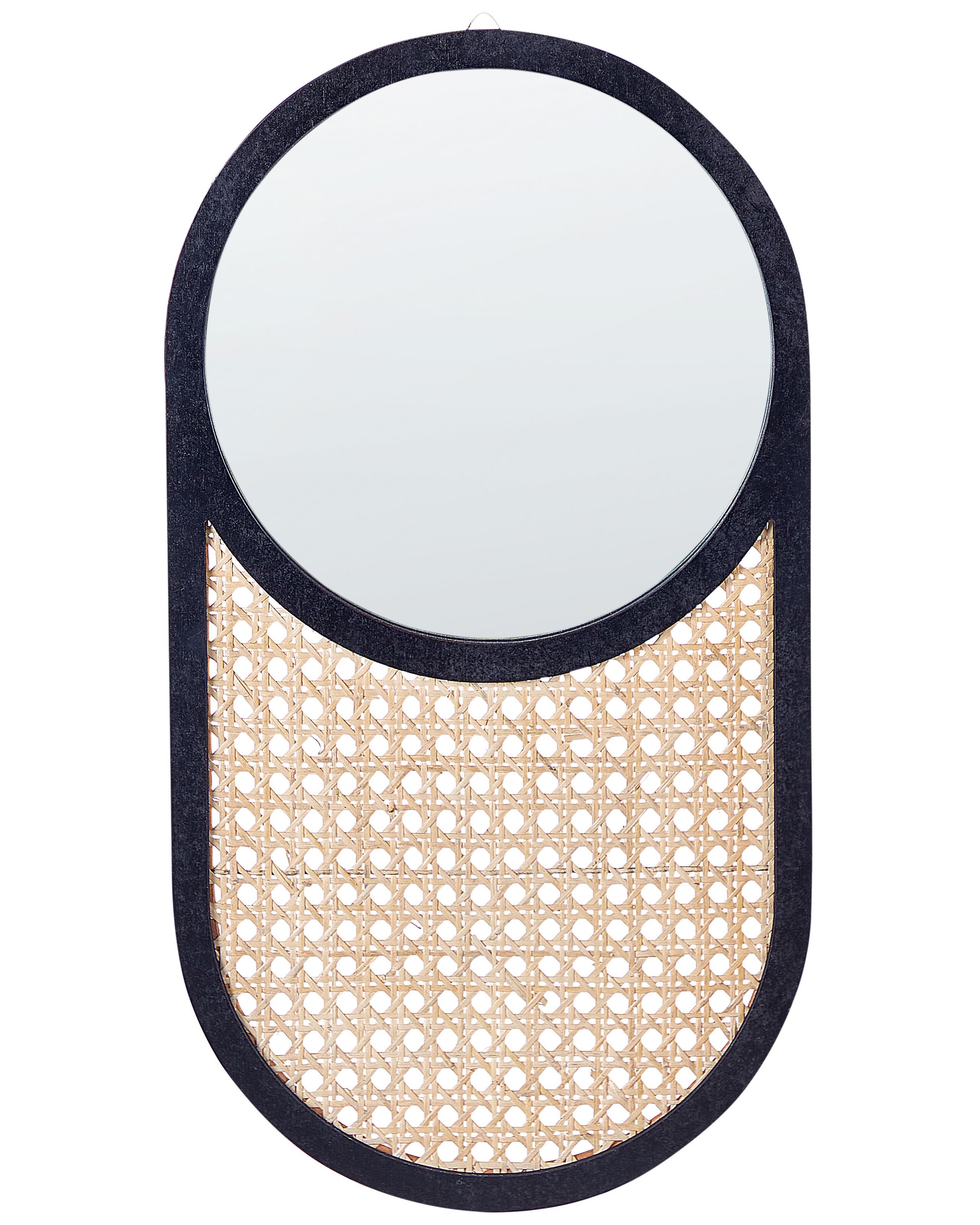 Embrace the allure of natural style with this captivating handmade wall-hanging mirror, meticulously crafted from the warm embrace of rattan. Its oval shape, enhanced by a delicate Viennese braid, exudes an air of effortless elegance that will transform your living space into a bohemian haven. The hue of rattan intertwines seamlessly with the gleam of the glass, creating a harmonious blend of organic and modern aesthetics. Place it in your bedroom, living room, or entryway to become an eye-catching focal point. Details: Color: Natural, Beige, Black. Main material: Rattan. Additional material: Glass. Weight: 1 Assembly: Does Not Require Assembly Wood type: Calamus Wood Origin: China