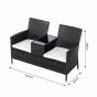 This double seat rattan chair using metal for the base frame to provide underlying strength for seasons to come, it is crafted into an all-in-one two seat and middle table design – giving space for you to sit with a friend with a place to keep drinks, books and smaller items right next to you. Dark grey in colour, PE wicker rattan is wrapped around the metal, giving this duo seat style and protection against mild weather damage to make it a long lasting addition in your garden. Fire-retardant for safety, thick cushions are placed on the seats for comfort, with water-resistant covers which can be cleaned for hygiene, with thick tempered glass on the table for a smooth and sleek surface which is easy to keep clean.