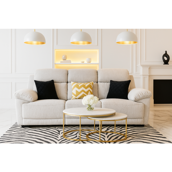 Generous and tech-enhanced, the Ravelle beige 3 seater recliner offers total comfort and modern function. Finished in soft-touch beige fabric with electric recline, wireless charging, cupholders and a centre console. Built to last and easy to relax in. Also available in grey. Matching 2 seater available.