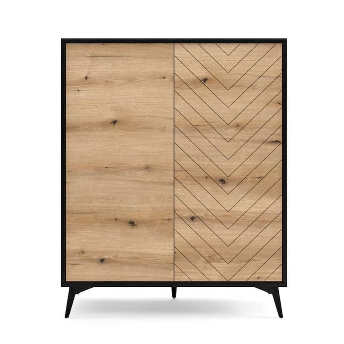 Embrace modern luxury with the Ravenna Serene Highboard Cabinet in Oak Evoke—a captivating fusion of style and functionality. Finished in Oak Evoke and black matte with chic metal legs, this highboard epitomizes contemporary elegance, seamlessly complementing any modern decor. With two push-to-open doors revealing four shelves and six closed compartments, it offers versatile storage for a clutter-free space. The precision-crafted design, featuring ABS edging and high-quality laminated board, exudes sophistication. Elevate your interior with this highboard that effortlessly marries form and function.