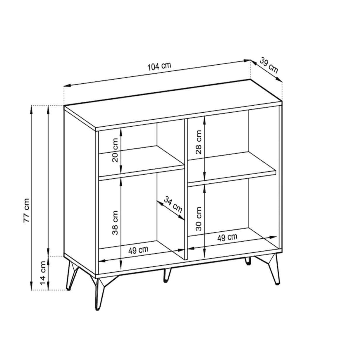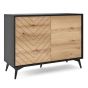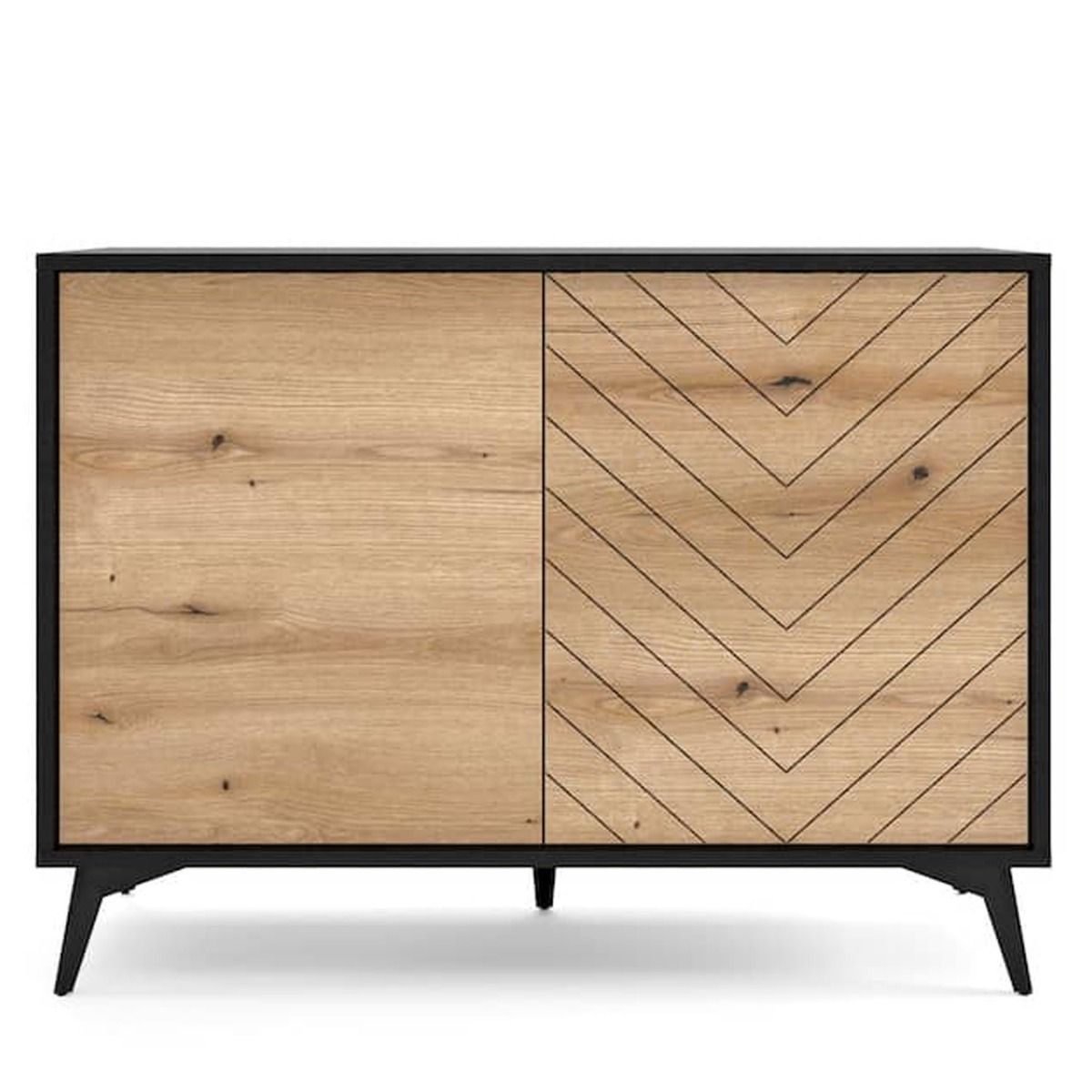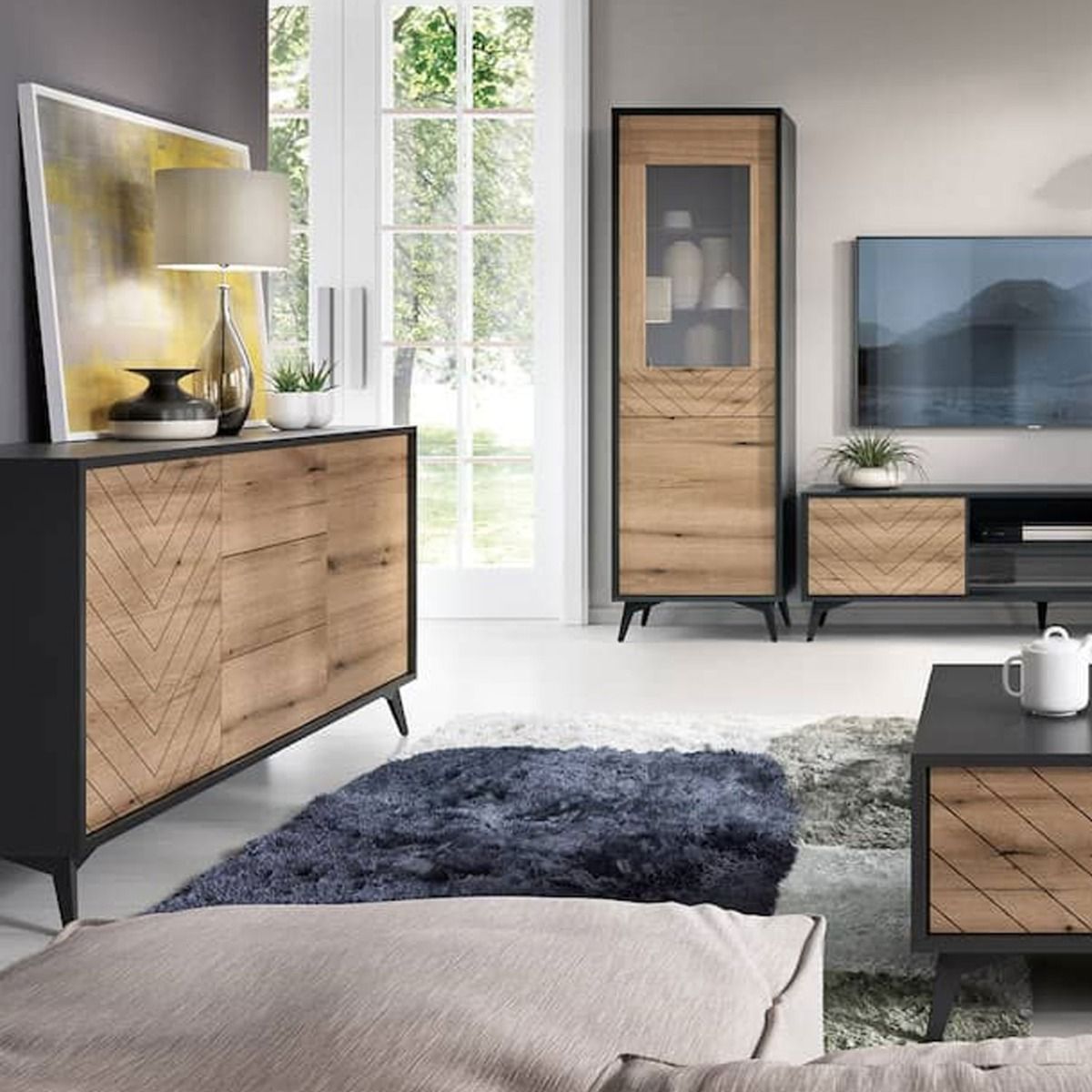 The Ravenna sideboard cabinet is a modern, elegant and exquisitely designed piece that can add a touch of sophistication to your dining area. Its timeless design features two hinged doors with four closed compartments for storing utensils and crockery in an organized manner. It is finished in an eye-catching combination of Oak Evoke and black matt that gives it a modern look, complemented by metal legs.