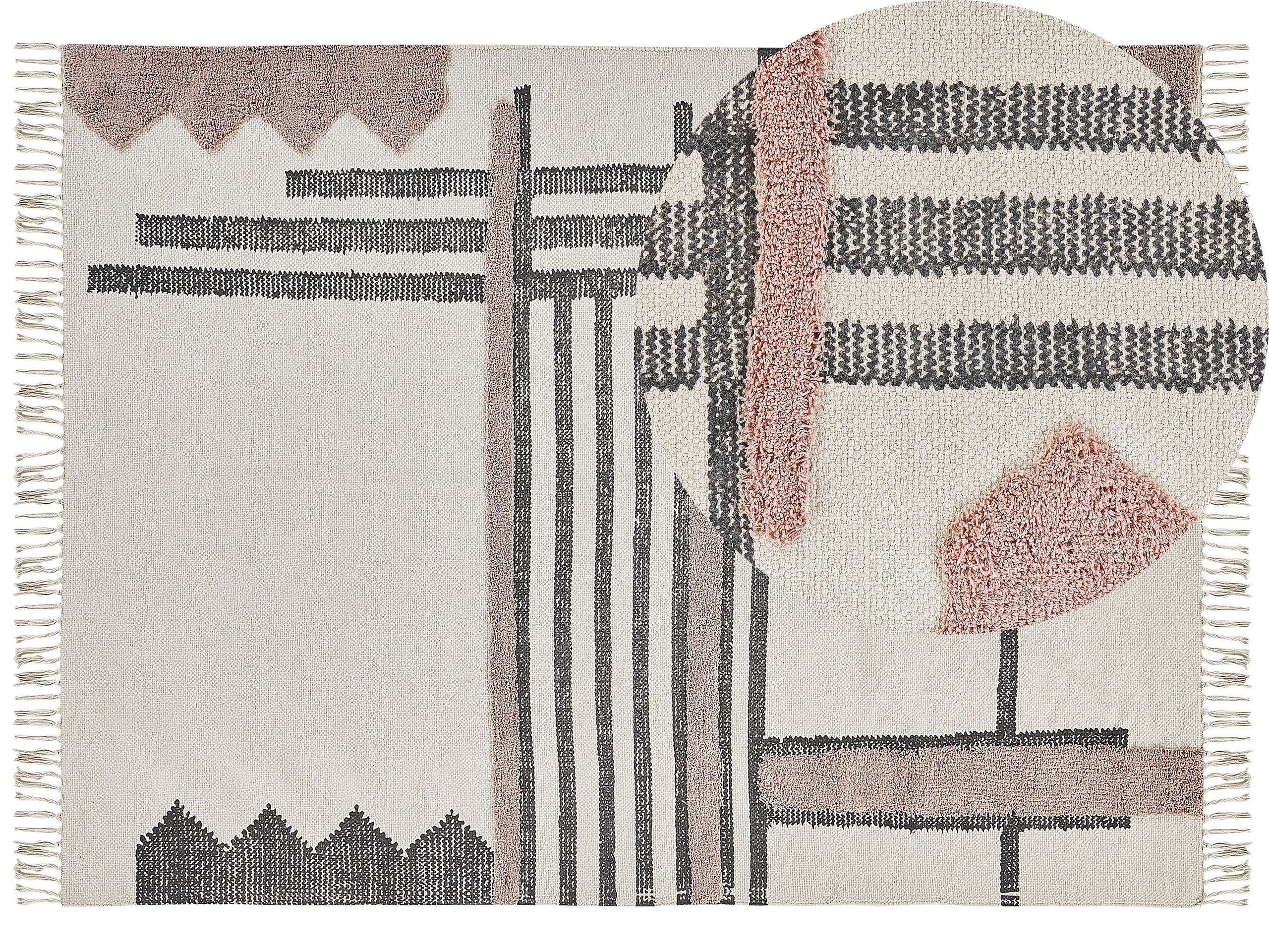 This decorative area rug is made for Scandinavian living rooms and bedrooms. Its fringed edges and a tufted abstract pattern make it stand-out, while the lightly coloured base brightens the overall mood of the room. Handwoven entirely from natural cotton, it is soft to the touch, and doesn't wear down easily. Details: Color: Beige, Black. Main material: Cotton. Material Composition: 100% Cotton Weight: 8 Assembly: Does Not Require Assembly