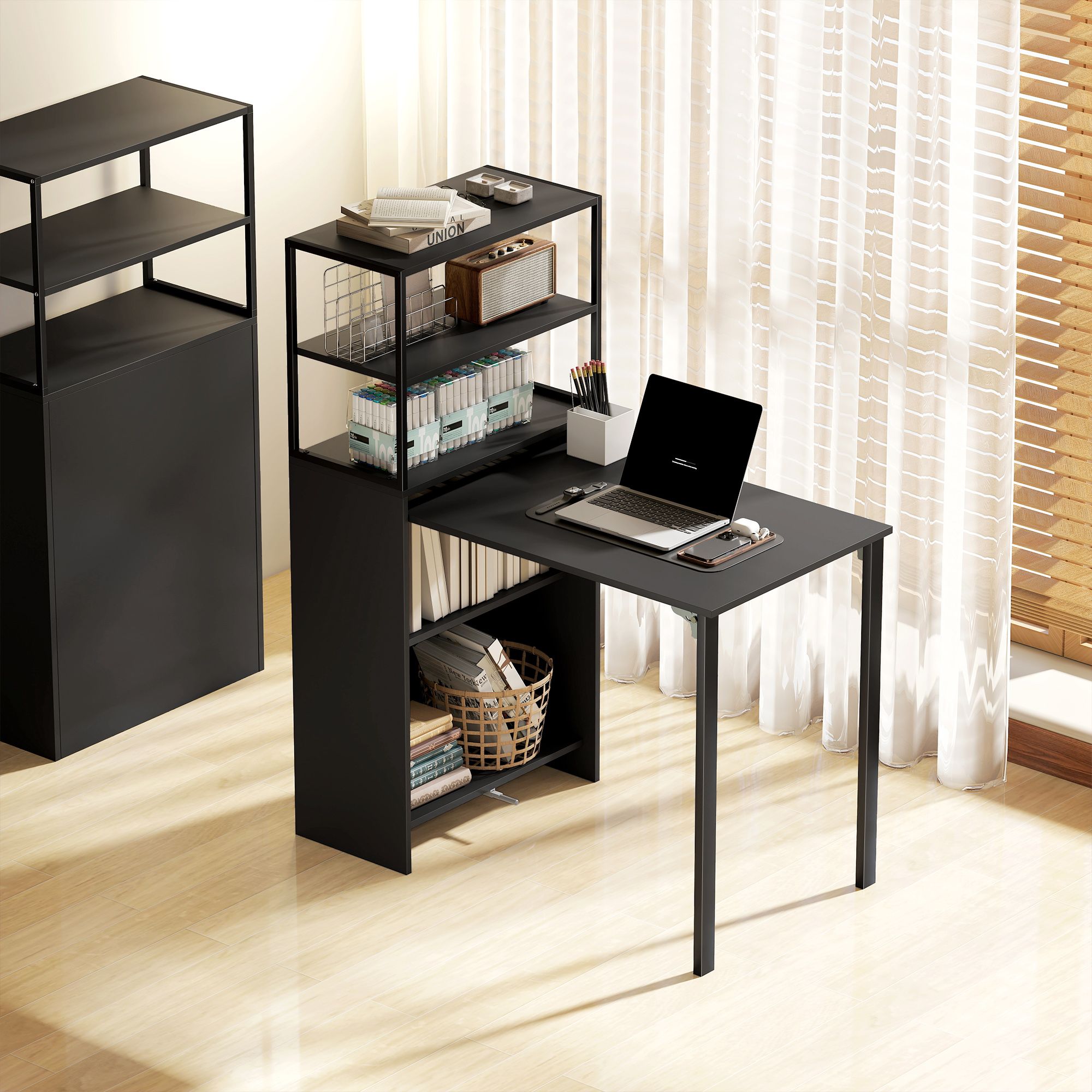 Shelf-to-workstation: computer table unfolds quickly and easily. Use it two ways - for holding books, ornaments and accessories and for working on. Four-tier shelf: offering plenty of room for holding books, ornaments and accessories. Upper shelves on office desk are exposed, whilst the two lower shelves are protected by the table. Steel frame: powder coated for extra strength, a tough core for this desk. Adjustable feet to keep balance as needed and protect the floor from light marks and scratches. Space-saving design: bedroom desk folds down to 30 cm wide - it doesn't take much space. Great for smaller offices, rooms and homes. Dimensions: 127 H x 105 W x 60 D cm. Folded: 127 H x 30 W x 60 D cm. Maximum load 80 kg. Assembly required