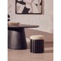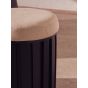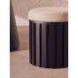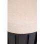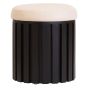 The RENSHARA stool features black mango wood base with ridge design and textured cream linen upholstered seat.
