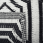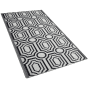 This reversible area rug is an eye-catching decoration, suitable for both indoor and outdoor use. Made of durable synthetic material, it is durable and easy to maintain. The rug features a beautiful geometric pattern in black, which blends well with any decor style. Details: Color: Black, White. Main material: Polypropylene. Material Composition: 100% Polypropylene Weight: 1 Assembly: Does Not Require Assembly