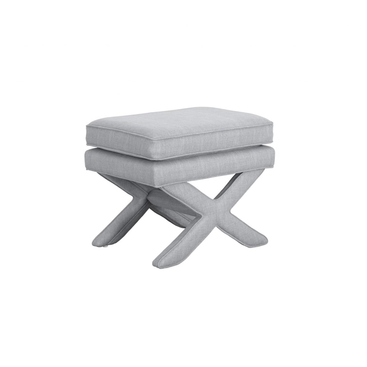 The RHOAN stool features light grey linen blend fabric and a pillow top design, with X-shaped legs for a stylish touch. Its neutral colour fits seamlessly into any environment, making it a versatile, multipurpose piece.